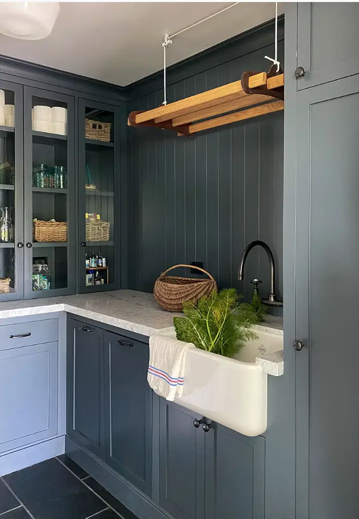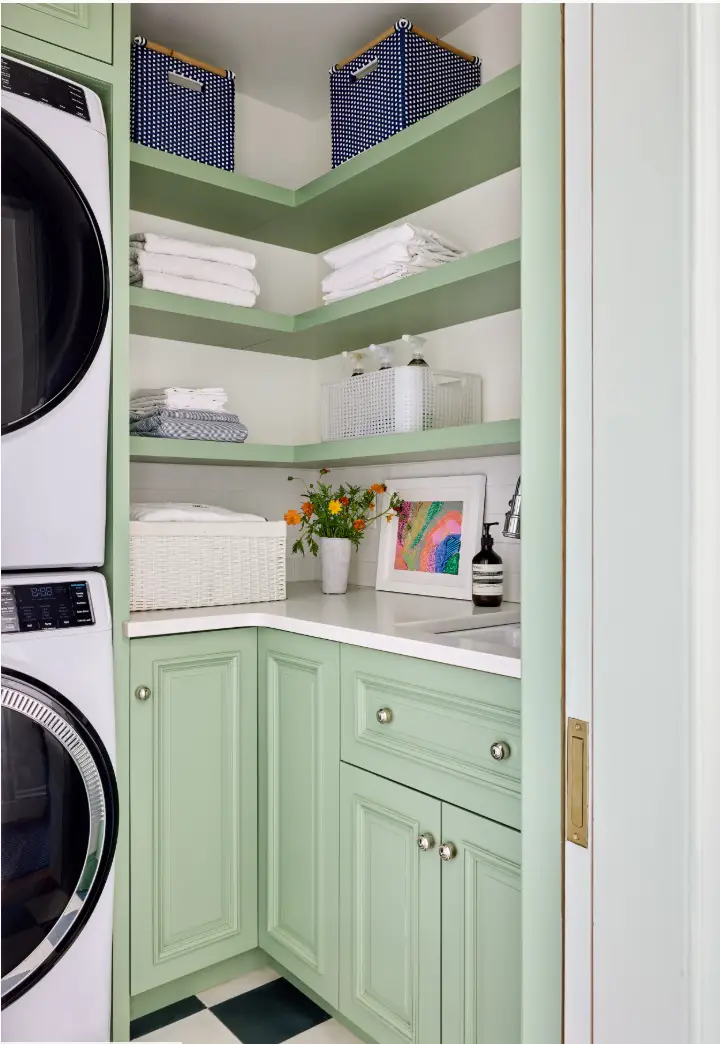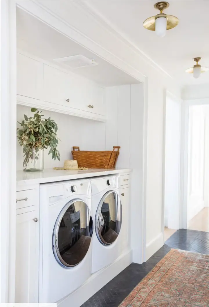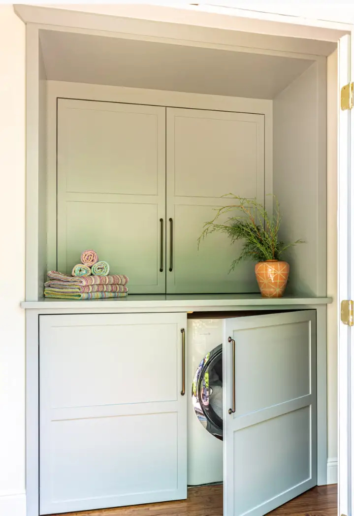 Pour conserver une buanderie visuellement harmonieuse, l’équipe de Camden Grace Interiors a choisi de dissimuler le lave-linge et le sèche-linge derrière des portes de placard. Cette astuce permet de masquer instantanément l’espace technique et d’intégrer la buanderie de façon plus discrète dans la maison. En plus d’apporter une sensation d’ordre, cette solution libère davantage de surface de travail, idéale pour plier, trier et organiser le linge au quotidien.