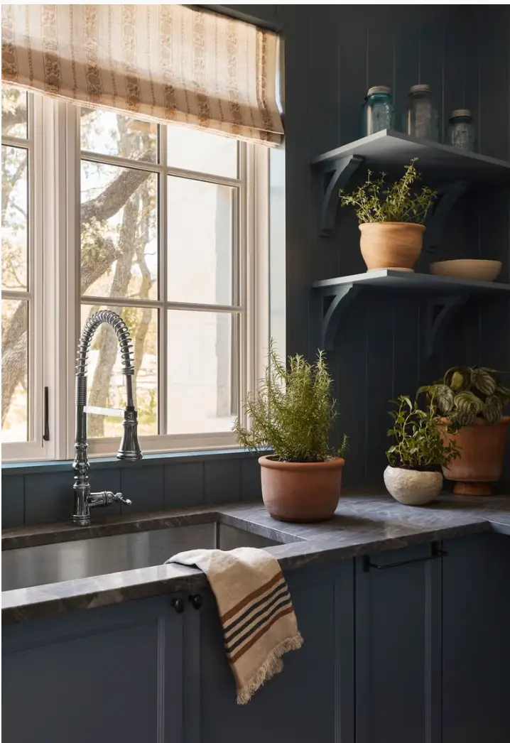 Contrairement aux idées reçues, les teintes foncées peuvent parfaitement trouver leur place dans une petite buanderie. Associées à une belle lumière naturelle, elles apportent de la profondeur et donnent parfois même une impression d’espace. Ce design imaginé par la designer Alison Giese en est la parfaite illustration : les comptoirs en quartzite foncé deviennent la véritable pièce maîtresse de la pièce, apportant caractère, élégance et une touche résolument contemporaine.