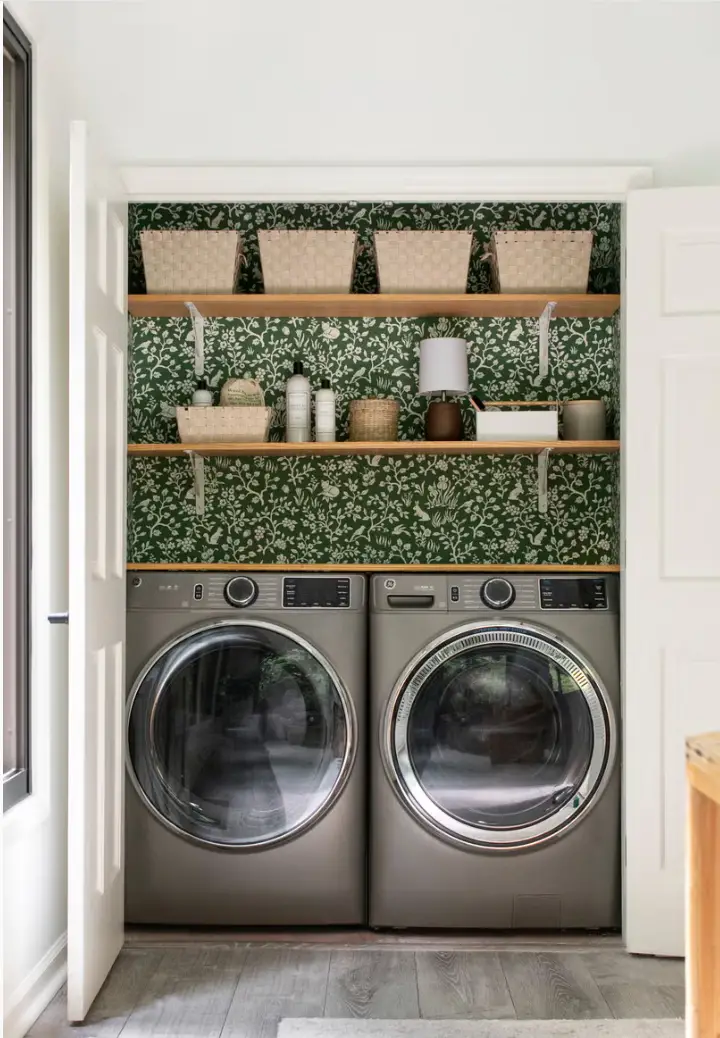 Lorsque l’espace manque, chaque recoin peut devenir une opportunité. La blogueuse Eden Passante, à l’origine de Sugar and Charm, a ainsi transformé l’un de ses placards en un véritable coin buanderie. Grâce à des étagères élégantes, un papier peint soigneusement choisi et des boîtes de rangement assorties, tout est parfaitement organisé. Une solution astucieuse qui prouve qu’il est possible d’aménager une buanderie fonctionnelle et esthétique, même dans un espace réduit.