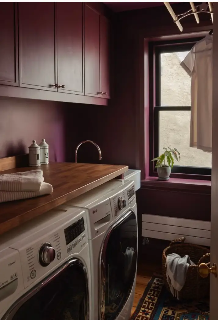 Pour transformer une petite buanderie en un espace à la fois fonctionnel et élégant, la designer Alexis Pew, du studio Kaminski + Pew, mise sur une teinte merlot profonde. Cette couleur intense apporte profondeur et caractère, donnant l’impression d’une pièce plus vaste et raffinée.