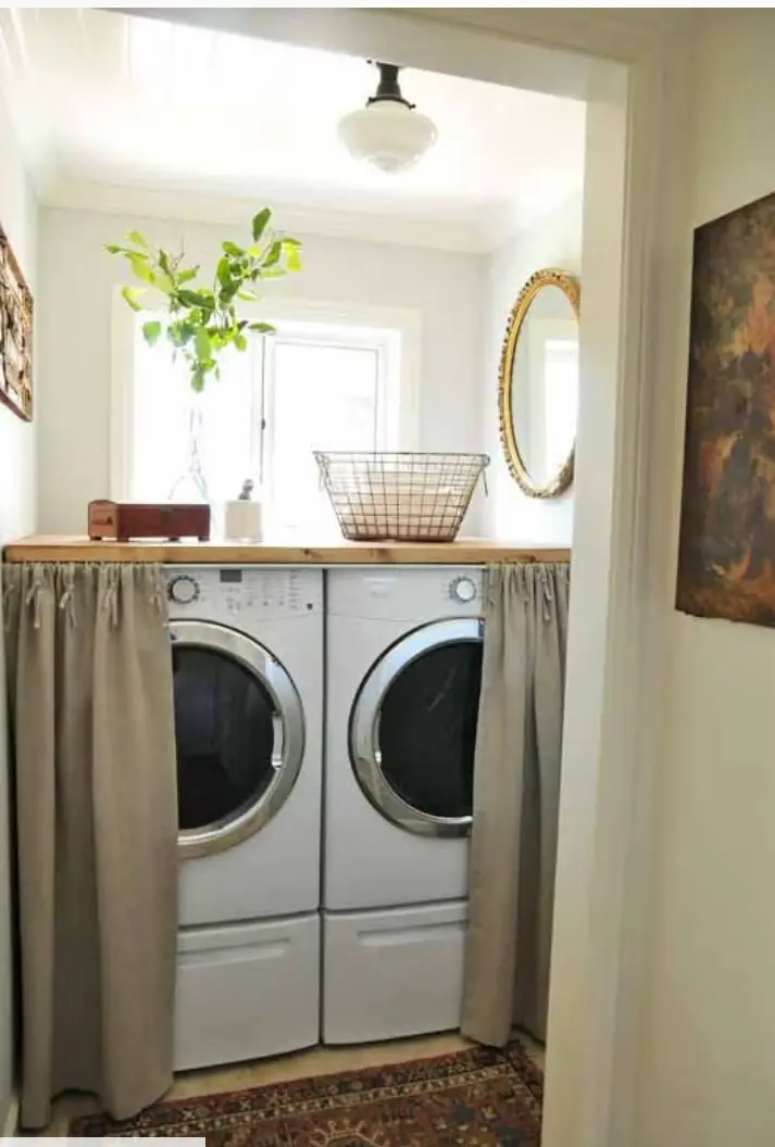 Dans une petite buanderie, pensez à cacher votre lave-linge et sèche-linge derrière une jupe ou un rideau, comme le suggère Heather Bullard. Astuce pratique et décorative, elle permet de transformer la buanderie en espace multifonctionnel, parfait pour allier organisation et style.