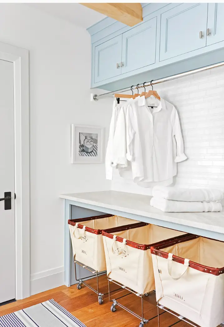 La designer Emily Henderson mise sur un trio de paniers à linge rétro : esthétiques et faciles à déplacer grâce à leurs roulettes, ils permettent d’organiser le linge de chaque membre de la famille avec style et efficacité dans une petite buanderie pratique.