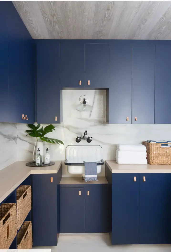Dans cette buanderie élégante, le Studio Life/Style mise sur des placards bleu marine, une crédence et un sol en marbre, rehaussés par un plafond en bois. L’applique murale de style campagnard éclaire parfaitement l’évier, alliant praticité et esthétique dans cet espace fonctionnel.