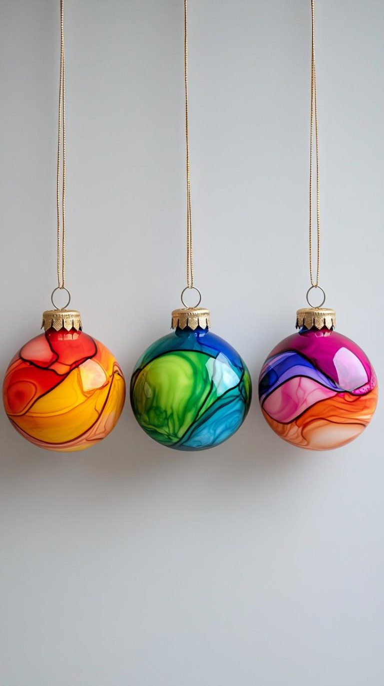 Boules de Noël en verre à l’encre alcoolisée aux couleurs vibrantes de l’arc-en-ciel.