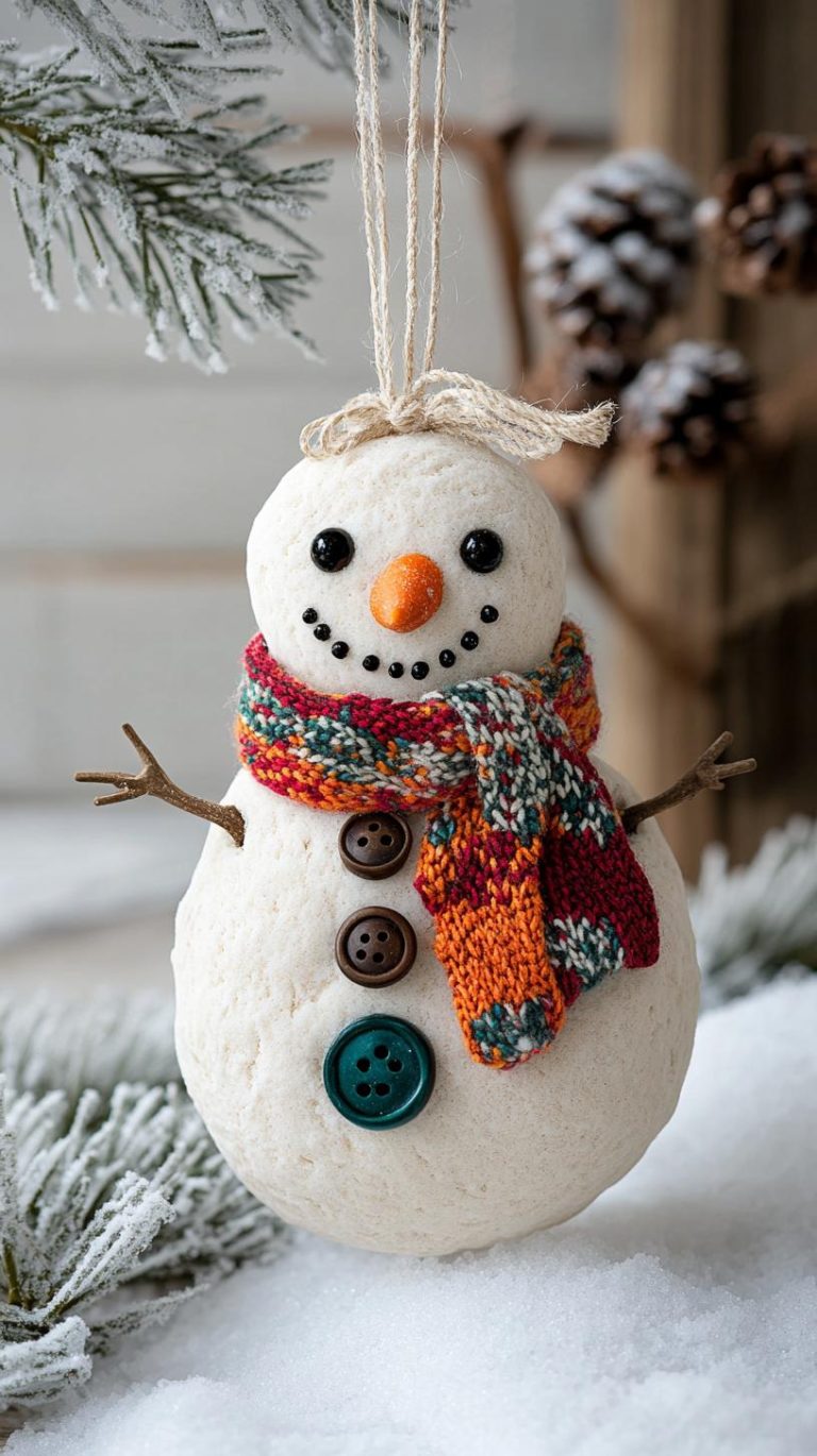 Décorations de bonhommes de neige en pâte à sel avec foulards et boutons peints