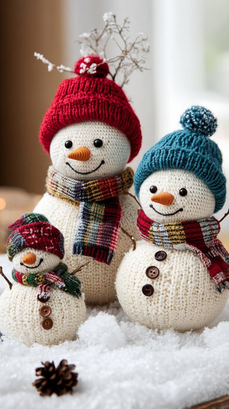 Bonhommes de neige en chaussettes avec des écharpes à carreaux et des décorations à boutons