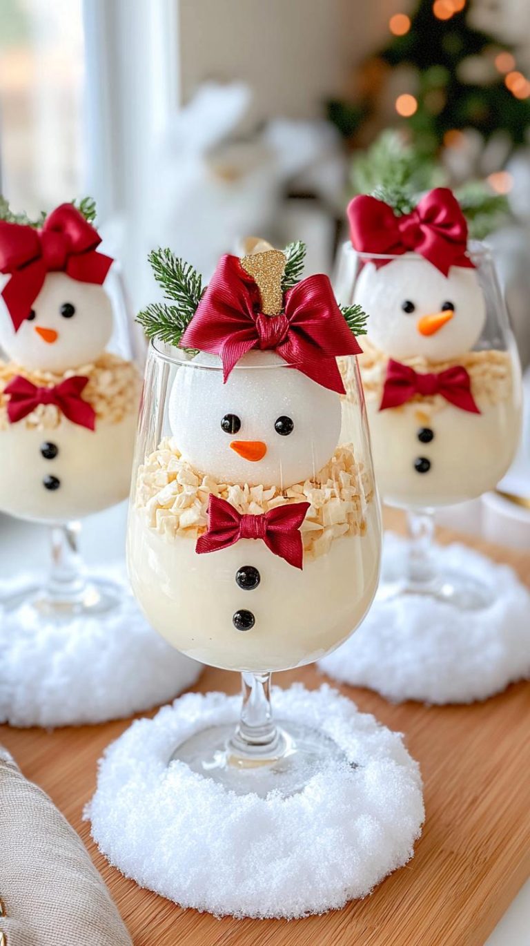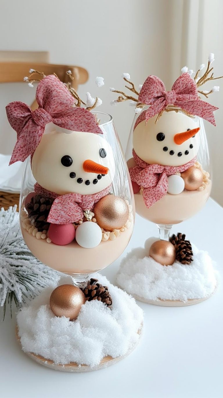 Bonhommes de neige en verre à vin avec nœuds en ruban sur socles enneigés