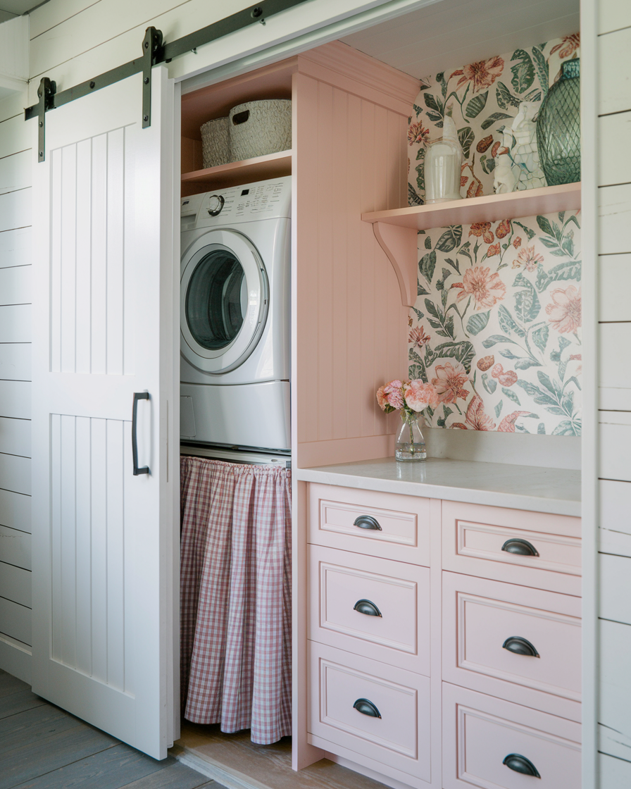 Cette petite buanderie prouve que la surface n’a rien à voir avec le style. Cachées derrière une porte de grange blanche, les machines à laver superposées s’intègrent parfaitement dans des pancartes sur mesure rose poudré – et cette jupe à carreaux vichy ? Un pur délice champêtre.