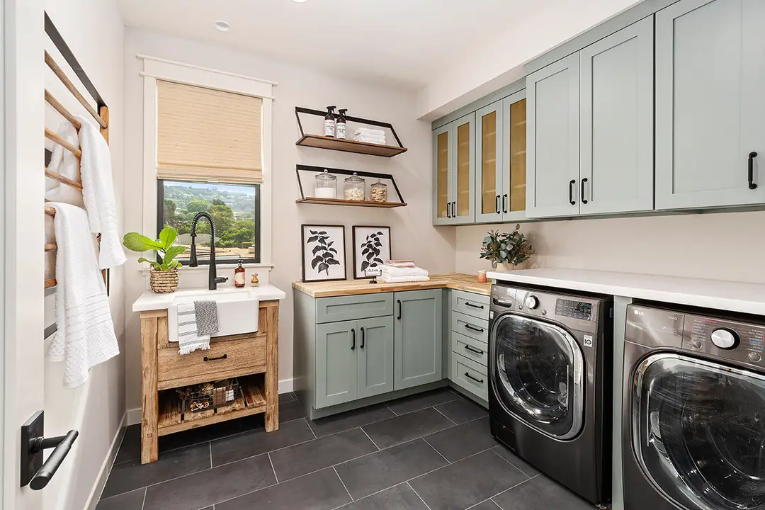 Il y a quelque chose de choisi dans cette teinte douce et naturelle qui contraste avec le bois chaleureux du plan de travail pour créer une superbe belle buanderie.