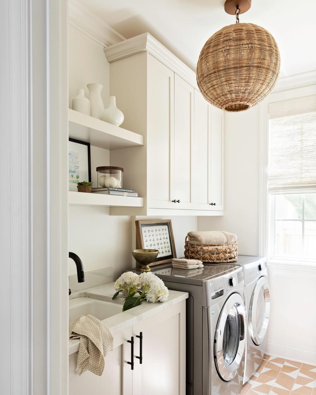 Cette buanderie est un véritable havre de fraîcheur grâce à sa palette de couleurs crème, ses textures tissées et son style soigné. Le carrelage à damier aux tons chauds apporte une touche champêtre et charmante, tandis que les placards intégrés et les étagères flottantes assurent un rangement impeccable.