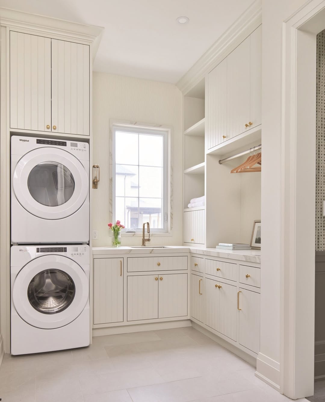 Si le paradis avait une buanderie, je suis persuadé qu’elle ressemblerait à ça. Des meubles couleur crème, des poignées en or brossé et ces panneaux verticaux impeccables ? C’est comme une journée au spa pour vos chaussettes.