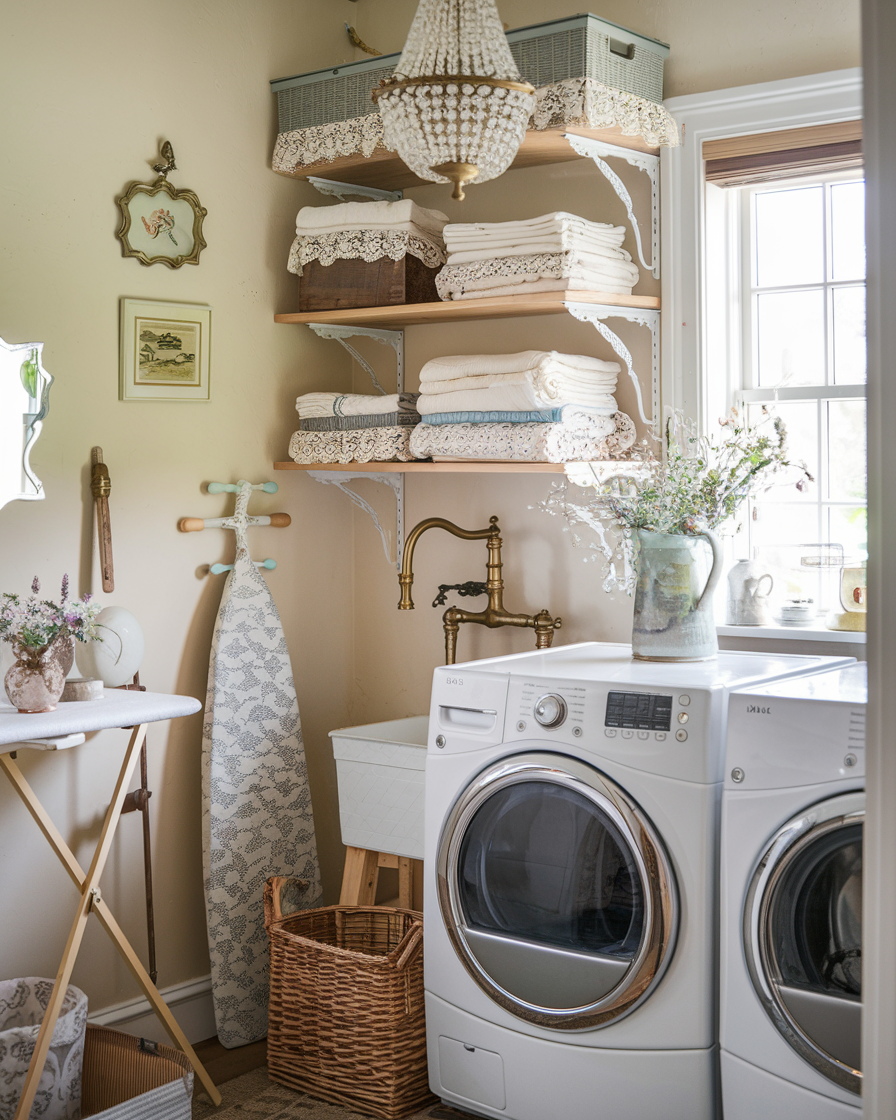 Cet espace respire le charme discret et une douce nostalgie, des étagères bordées de dentelle festonnée au robinet en laiton ancien qui semblent tout droit sorti d’une auberge provençale. Un petit lustre apporte une touche de glamour inattendue, captant la lumière de la fenêtre voisine, tandis que la planche à repasser vintage et les paniers en osier ajoutent une note de texture authentique.