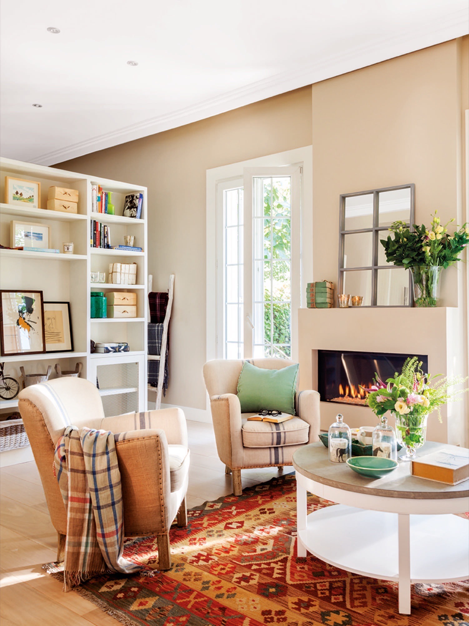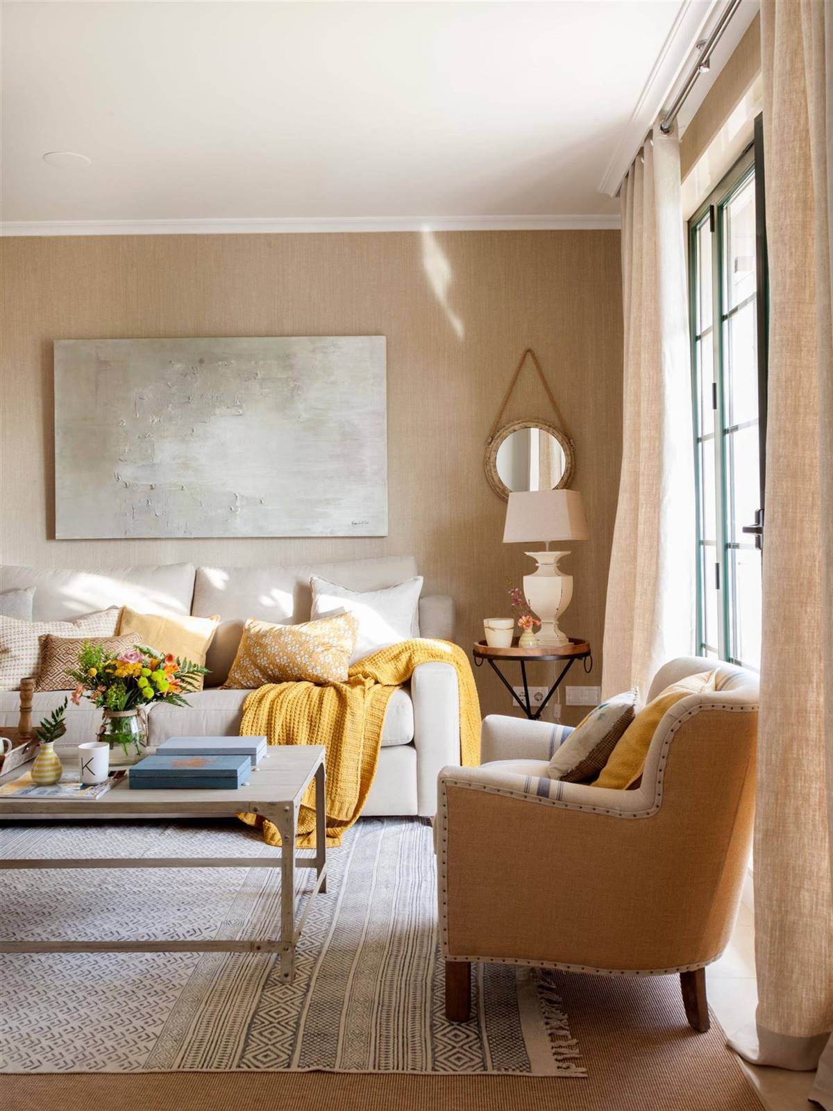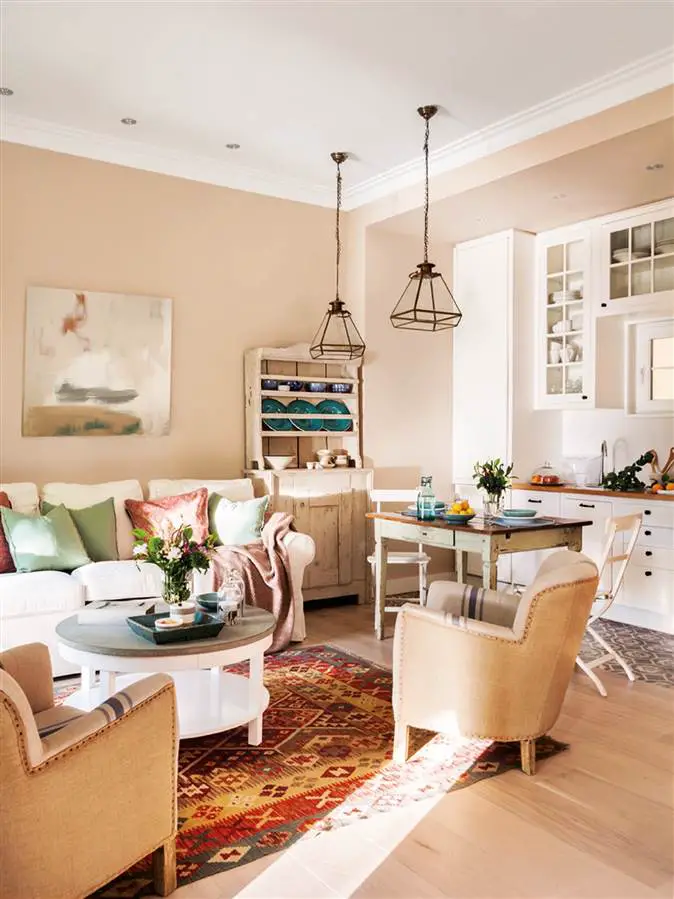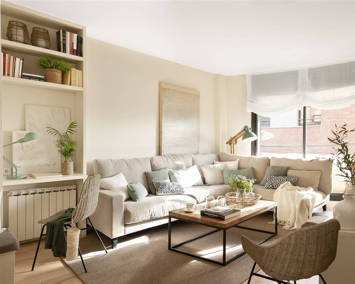Tous les meubles arborent la même palette de couleurs, mais Natalia Gómez Angelats, la décoratrice de la rénovation, a décidé d’y apporter une touche créative avec un tapis et des coussins, rompant ainsi avec le style dominant de la pièce. Juste ce qu’il fallait de « vive » pour ce salon.