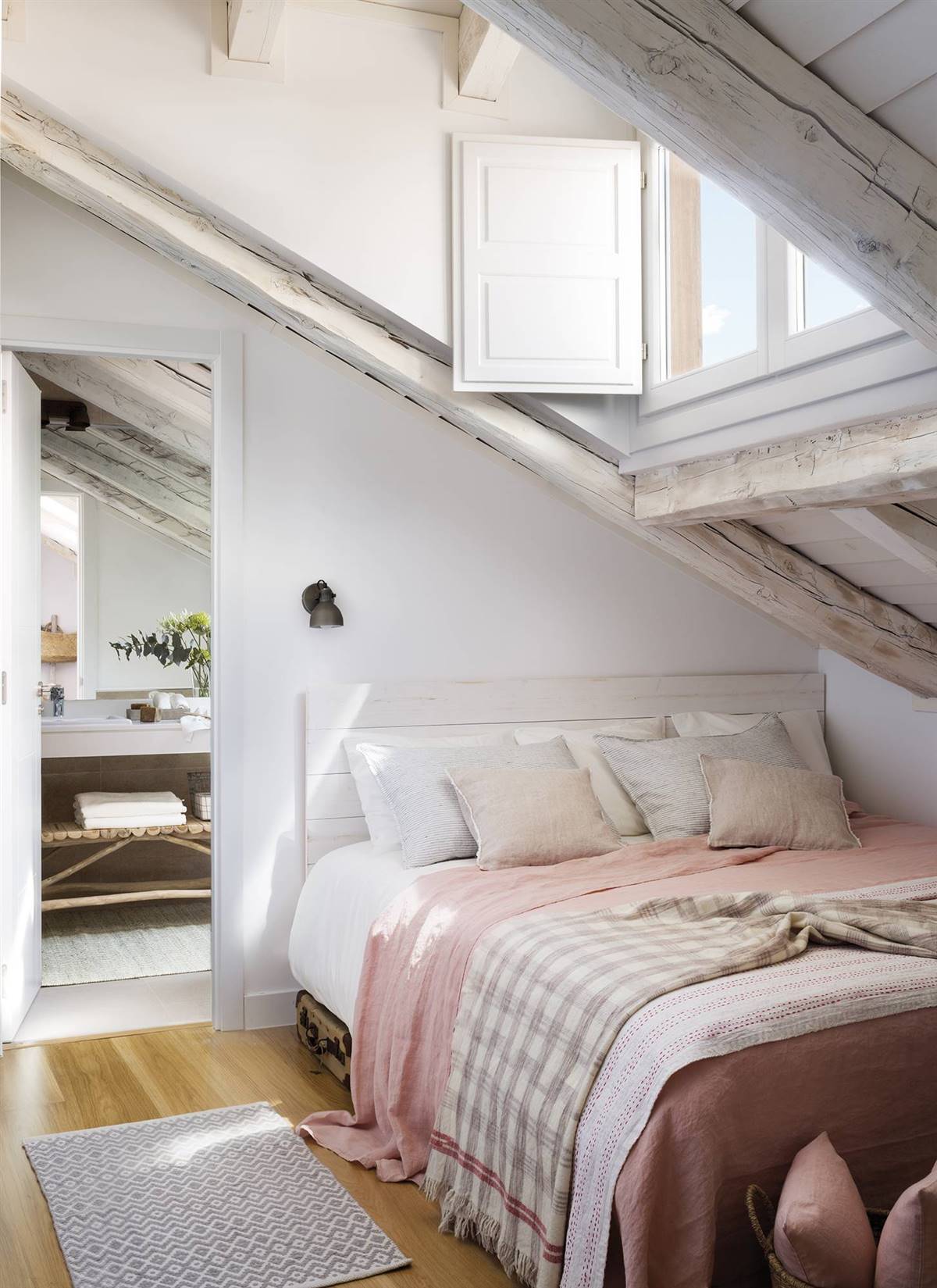 Paula a combiné la structure unique des combles de la chambre pour créer une décoration unique et donner à cet espace sa propre personnalité. Une lucarne apporte de la lumière dans la chambre et permet d’admirer les étoiles depuis le lit.
