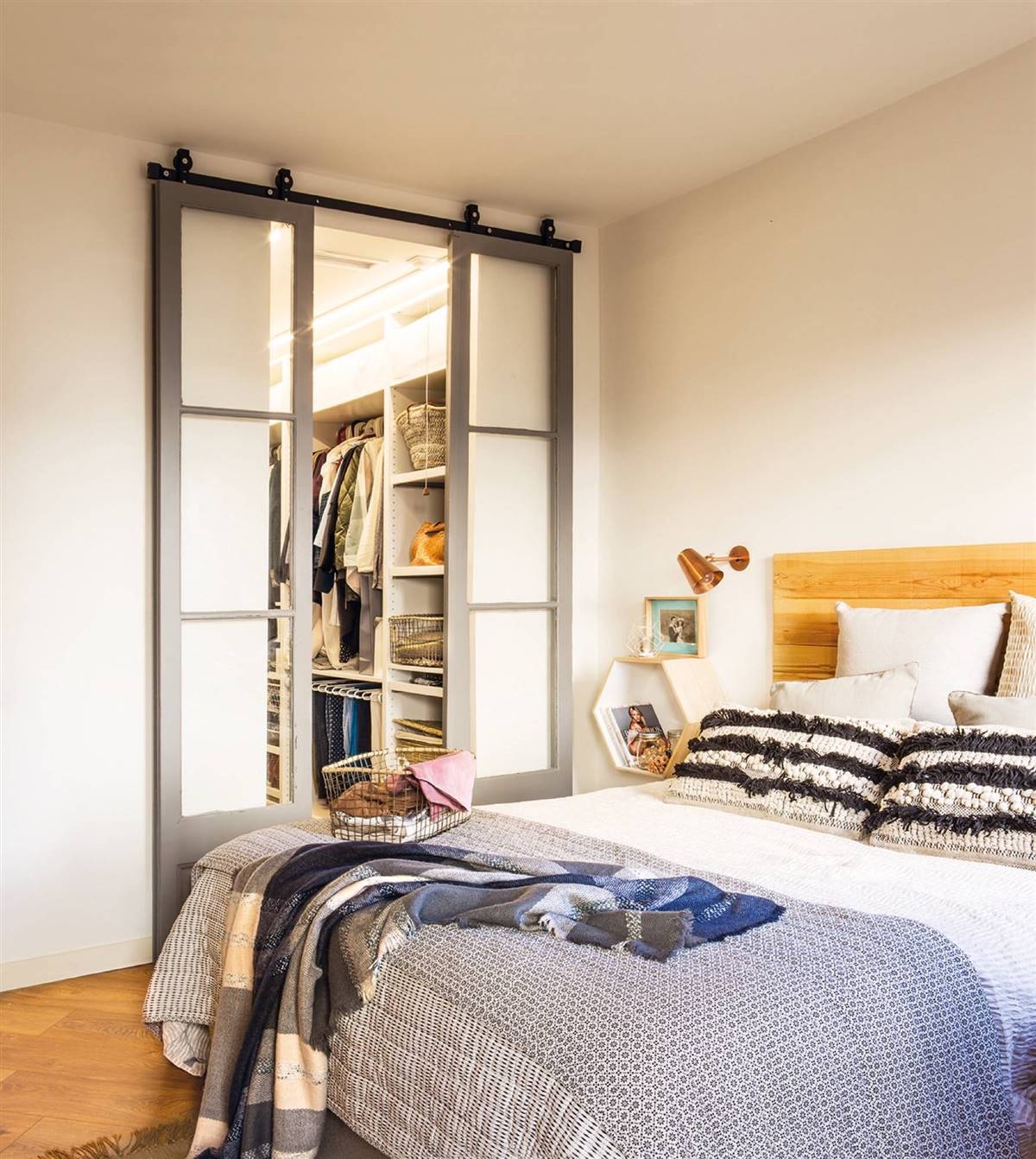 Bien que l’ appartement ne fasse que 80 m² , la chambre dispose de son propre dressing. Ouvert, comme un placard, il est séparé de la chambre par une porte coulissante fabriquée à partir de deux portes de récupération.