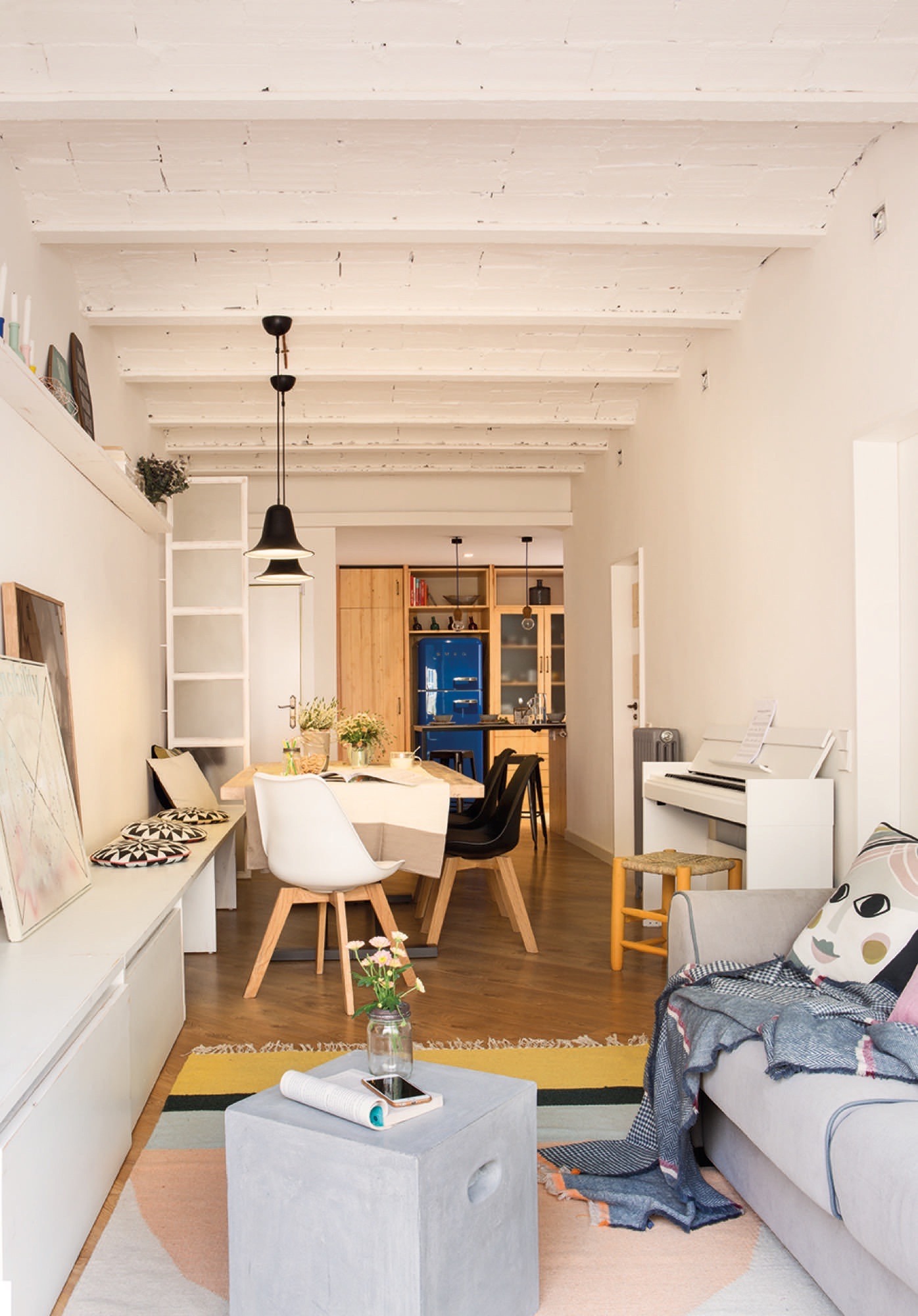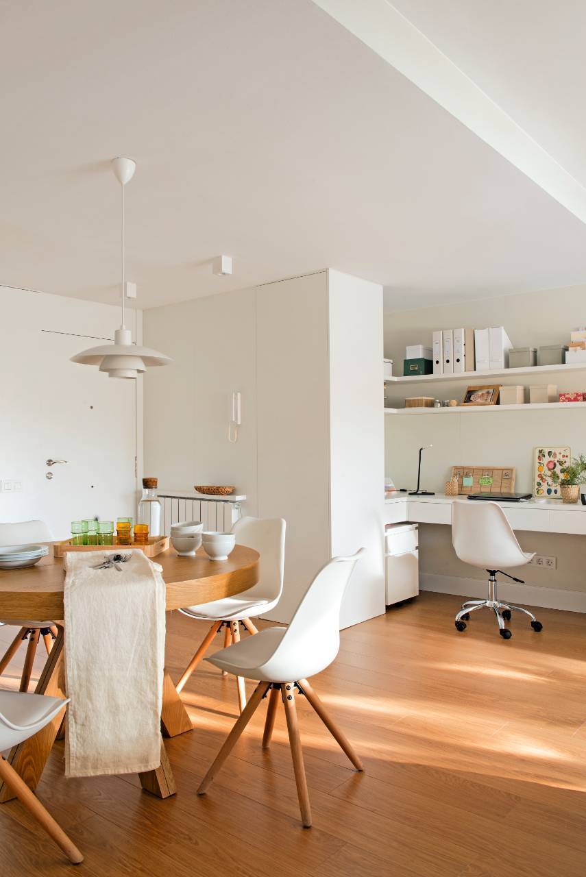 C’est difficile à croire, mais la surface n’est que de 70 m² . Pourtant, la décoratrice Carme Pardo l’a presque doublée, prenant chaque centimètre pour acquis. Elle a commencé par abattre les murs du séjour, créant un espace ouvert abritant le salon, la salle à manger et le bureau.