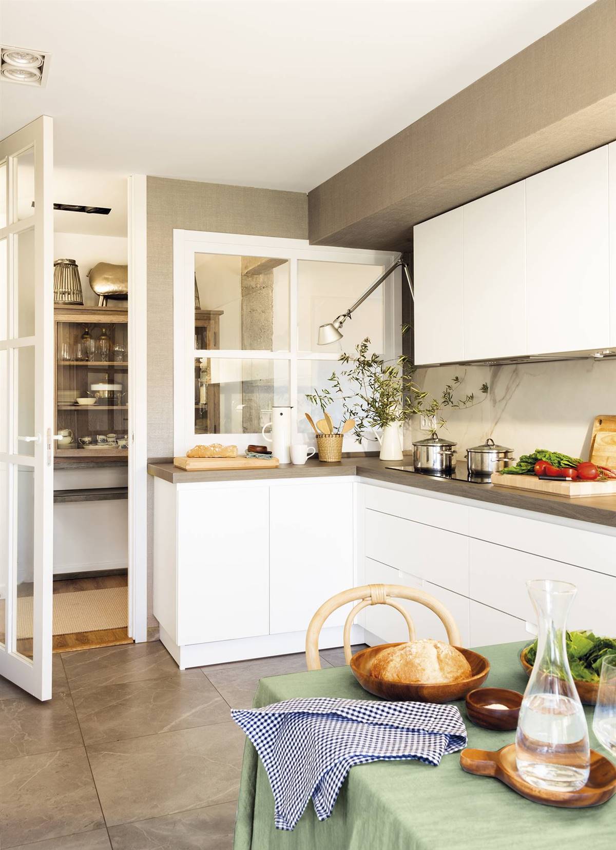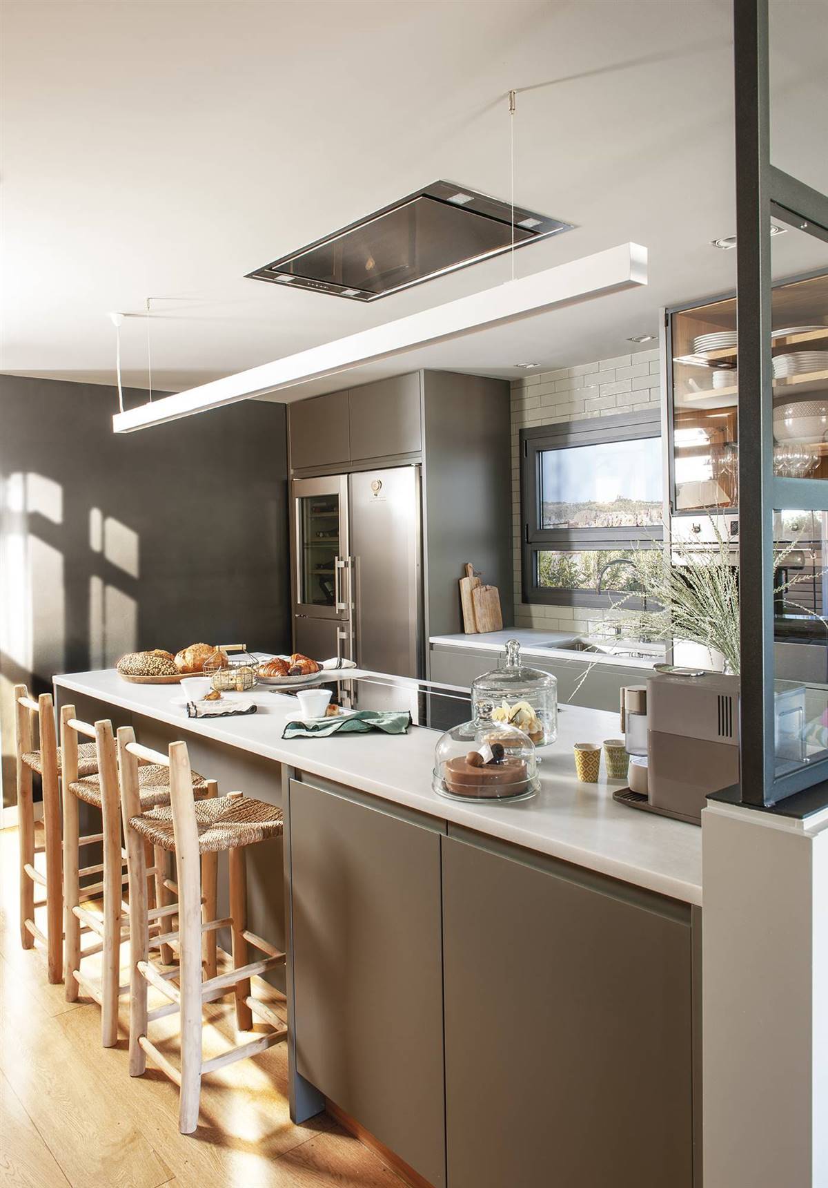 Deux tabourets, parfaits pour le petit-déjeuner, ont été ajoutés, transformant le couloir en un espace bien plus qu’un simple espace de passage. Derrière les portes coulissantes se cachent deux petits espaces : une buanderie et un garde-manger.