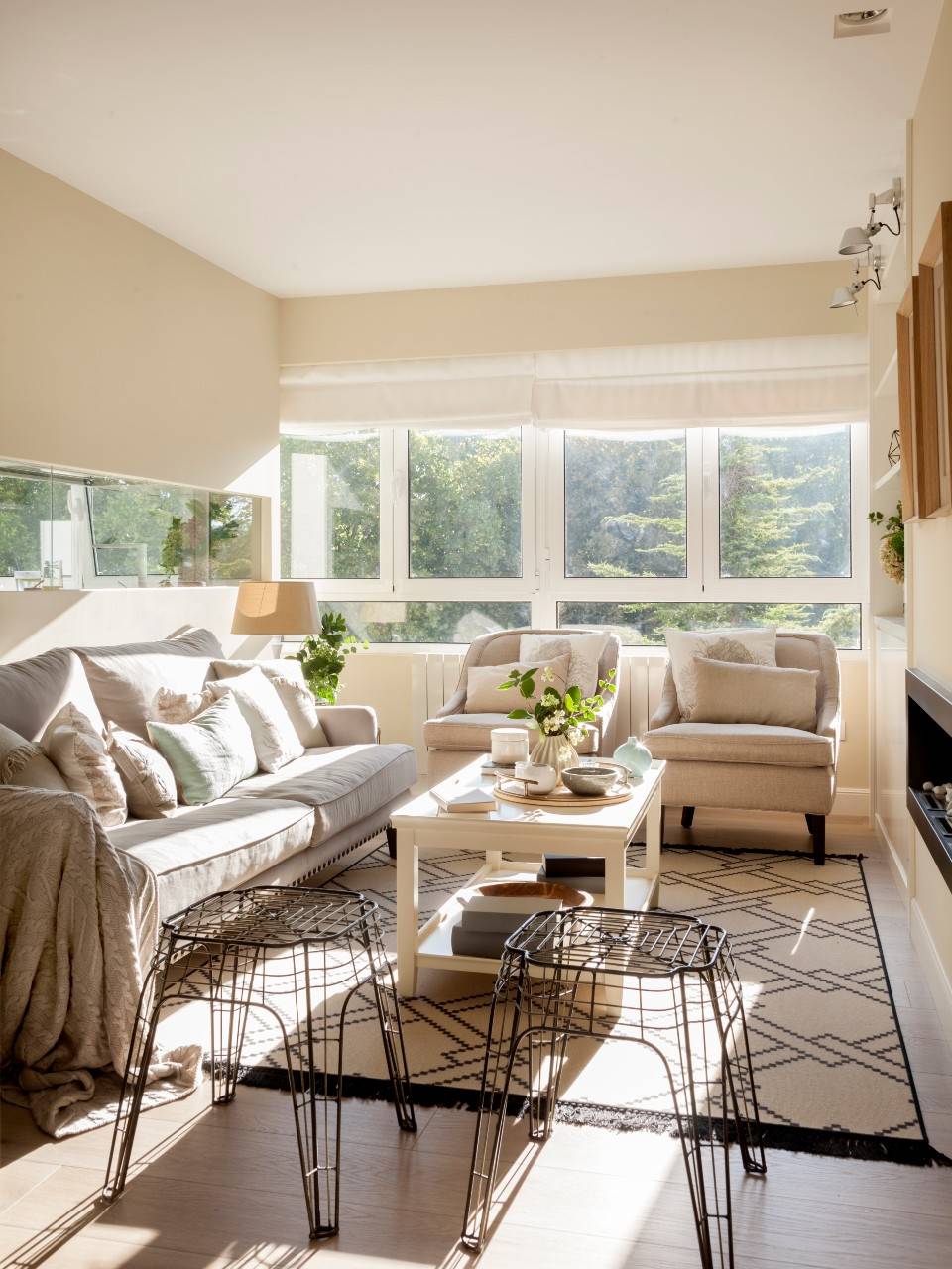Les murs et le canapé blancs ont également grandement contribué à l’éclairage. Natalia Zubizarreta a conçu la rénovation et a ajouté un grand tapis clair pour accentuer la luminosité.