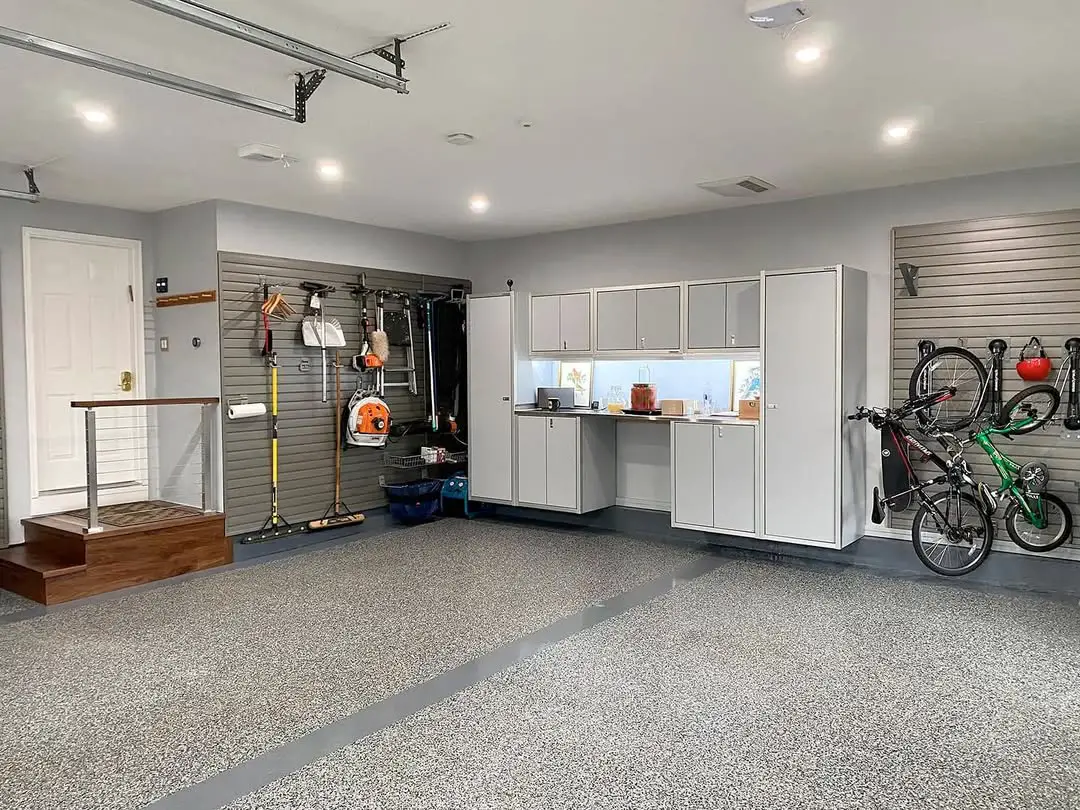 Des outils aux équipements sportifs, tout est rangé à sa place. Le sol en époxy apporte une touche d’élégance, tandis que l’éclairage sous les meubles hauts rend l’espace de travail lumineux et accueillant.