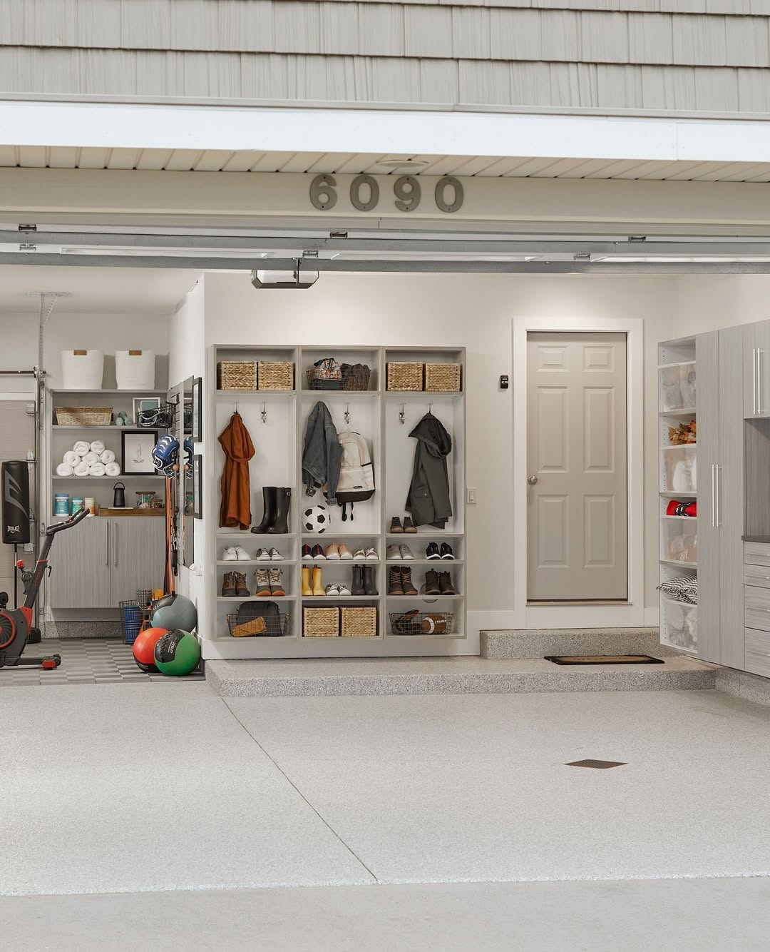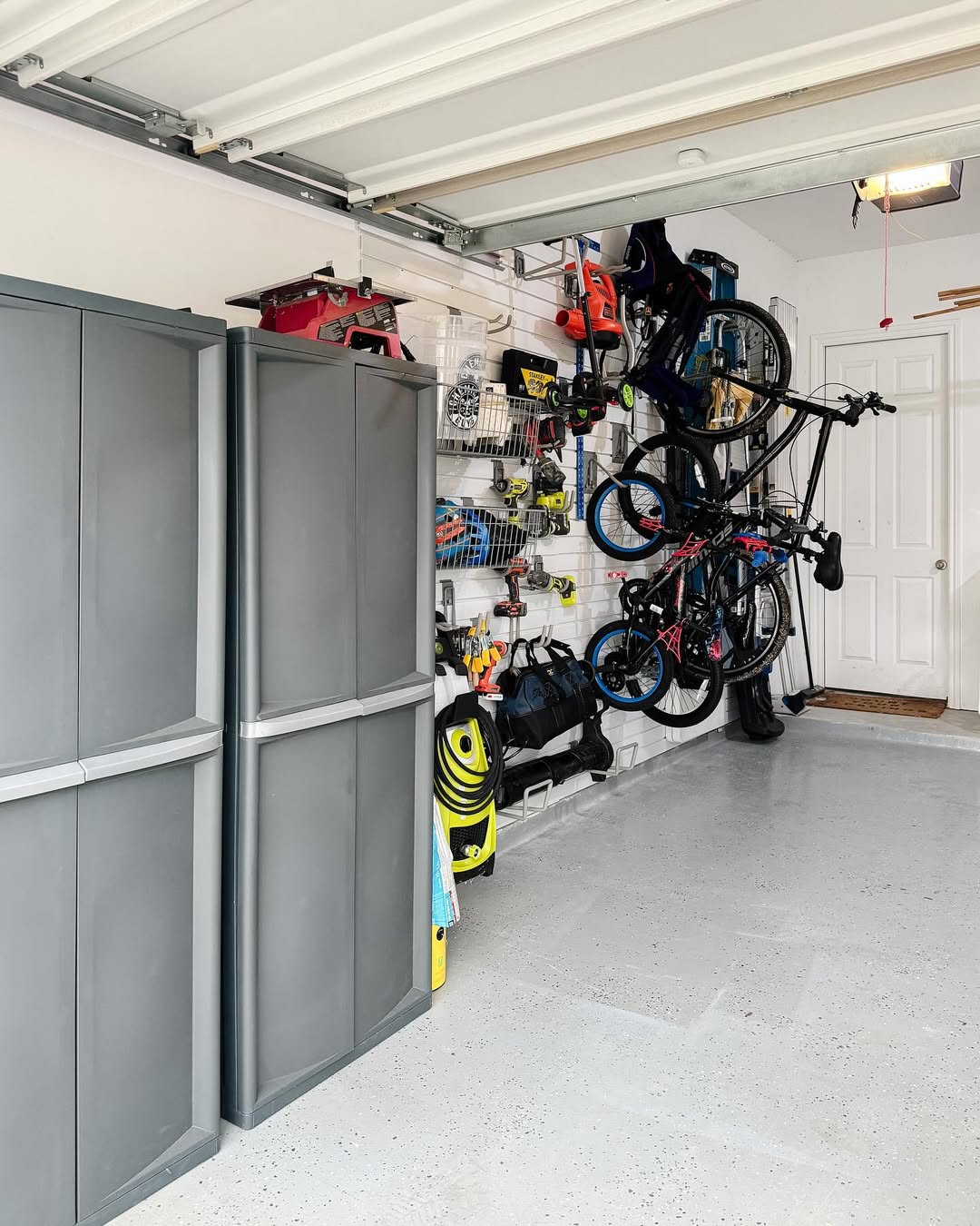 Ce garage se distingue par ses lignes épurées et son ingéniosité : crochets muraux, rangement vertical pour vélos et système d’armoires modulaires qui transforme le désordre en un aménagement… soigné.