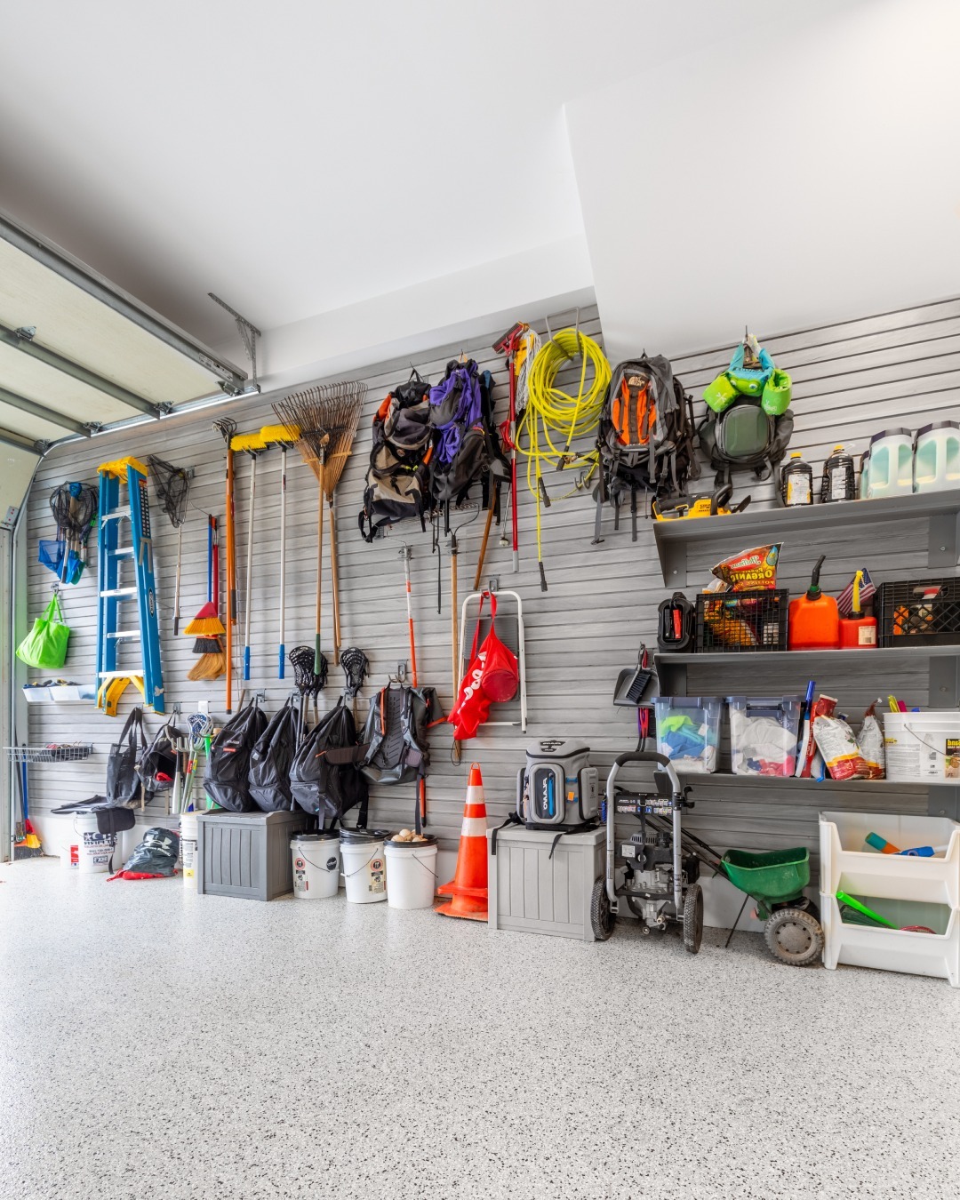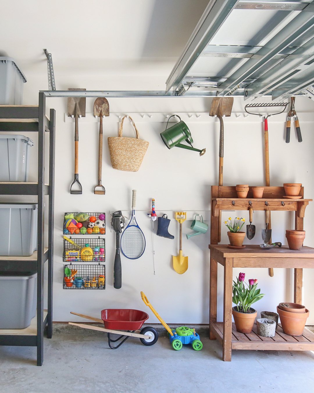 Ce n’est pas qu’un simple espace de rangement : c’est un véritable centre de commandement. Le système de panneaux à rainures transforme chaque balai, sac à dos et outil électrique en une pièce maîtresse verticale soigneusement agencée. Même les râteaux semblent tout droit sortis d’une expédition d’aventure en pleine nature.