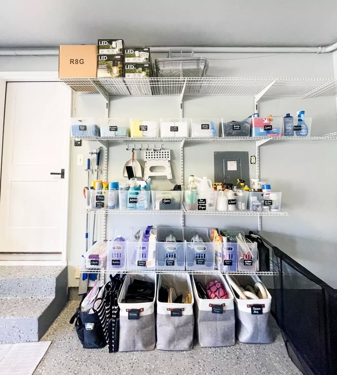 Ce garage a du caractère, mais aucun désordre. Système de bacs, étagères suspendues, rangements en hauteur : c’est le genre de garage où la vie suit son cours, mais où le désordre ne s’attarde pas.