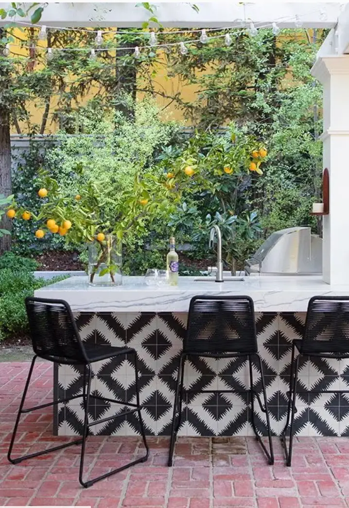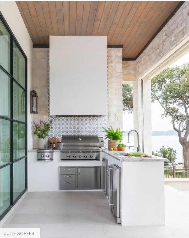 Une cuisine extérieure doit avant tout être fonctionnelle, sans pour autant négliger l’esthétique. Prenez exemple sur cette cuisine conçue par la designer Marie Flanigan , qui allie des éléments pratiques, comme un barbecue intégré et plusieurs réfrigérateurs, à des touches design telles qu’une crédence en carrelage sur mesure et une hotte en plâtre.