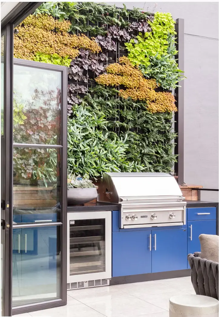 Dans cet espace patio conçu par Heather Hilliard , un barbecue intégré, une cave à vin et des rangements supplémentaires facilitent la réception, tandis que le mur végétal structure l’espace extérieur et exploite la hauteur sous plafond.