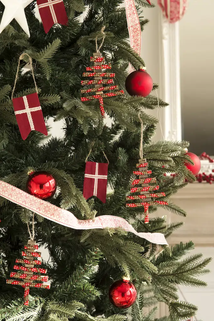 Cet arbre a un charme artisanal qui crée une atmosphère chaleureuse. La boule de corde ornée d’un flocon de neige rouge, l’étoile en tissu et la pomme de pin blanche semblent tout droit sorties d’un atelier de bricolage en famille.