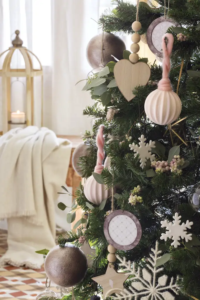 Ses boules rose pâle, ses cœurs en bois et ses ornements tressés créent une ambiance chaleureuse et discrète. Idéal pour les intérieurs lumineux, meublés de pièces claires et de textiles doux.