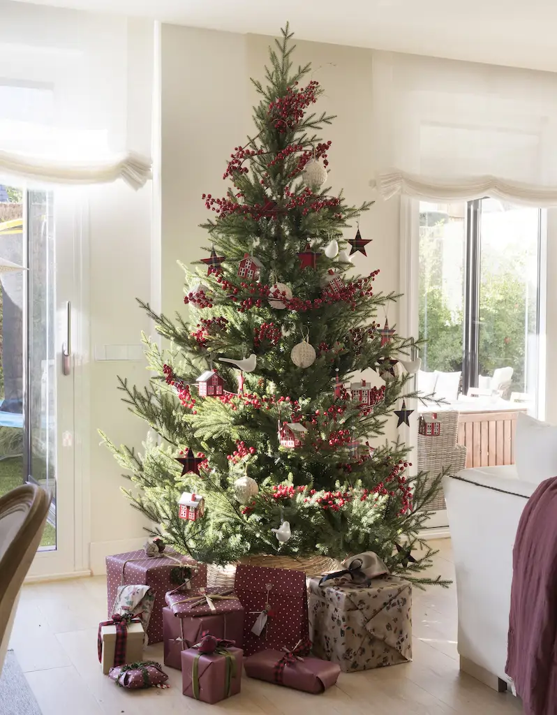 Ce sapin prouve que le bordeaux fait un retour en force pour Noël. Ses branches sont ornées de petites maisons, d’étoiles et de baies rouges qui apportent couleur et chaleur sans avoir recours aux paillettes.