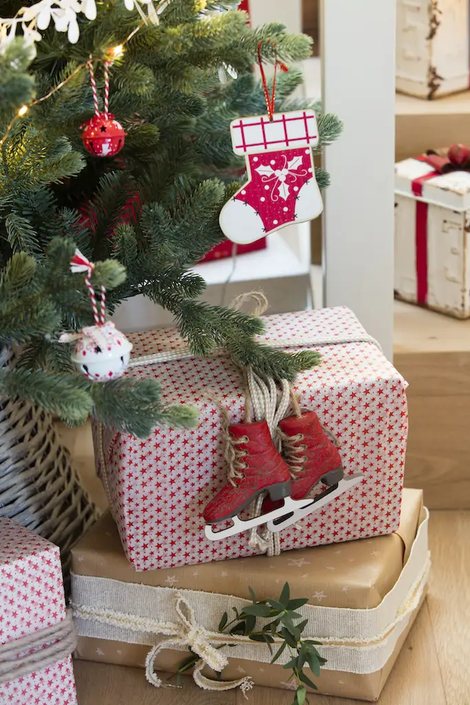 Ce sapin dégage un charme chaleureux et convivial. Les petits patins, les étoiles, les chaussettes rouges… Les cadeaux, emballés dans du papier simple et des rubans de tissu, s’harmonisent avec le pied du sapin. Il est gai, accueillant et possède des touches très modernes qui évoquent le style nordique.