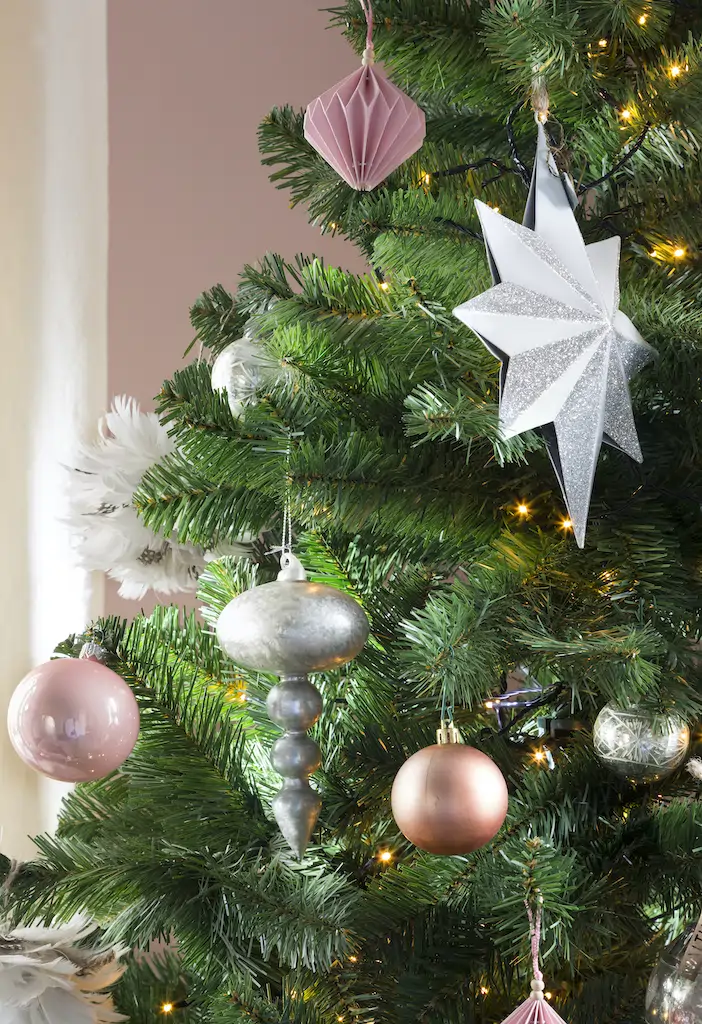 Certains sapins n’ont pas besoin de grand-chose pour charmer, et celui-ci en est un parfait exemple. Avec ses boules aux nuances de rose poudré et d’argent vieilli , il dégage une atmosphère de calme et de douceur.