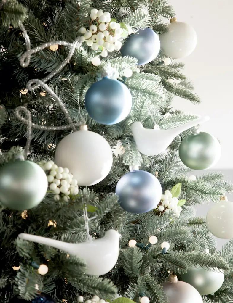 Cet arbre semble avoir été cueilli par une froide matinée ensoleillée. Les décorations bleues et vert glacé, les branches poussiéreuses et les petits oiseaux blancs perchés parmi elles créent une atmosphère de paix qui se répand dans toute la pièce.