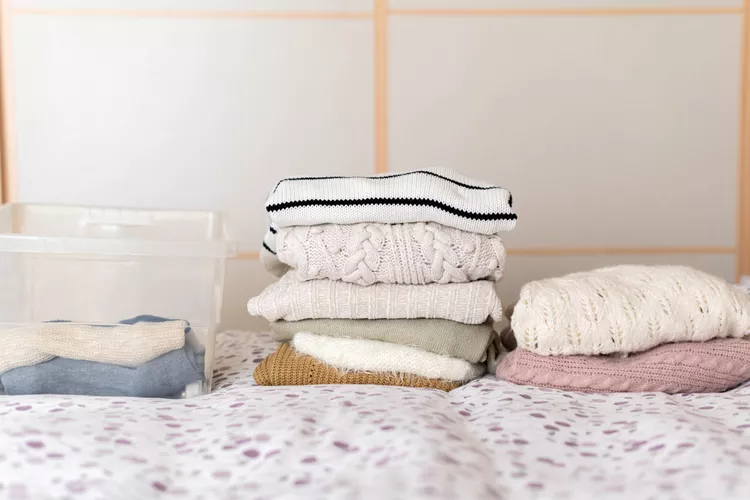 Tous les vêtements hors saison peuvent être rangés dans de grands bacs ou boîtes de rangement et placés sur l’étagère la plus haute de votre placard.
