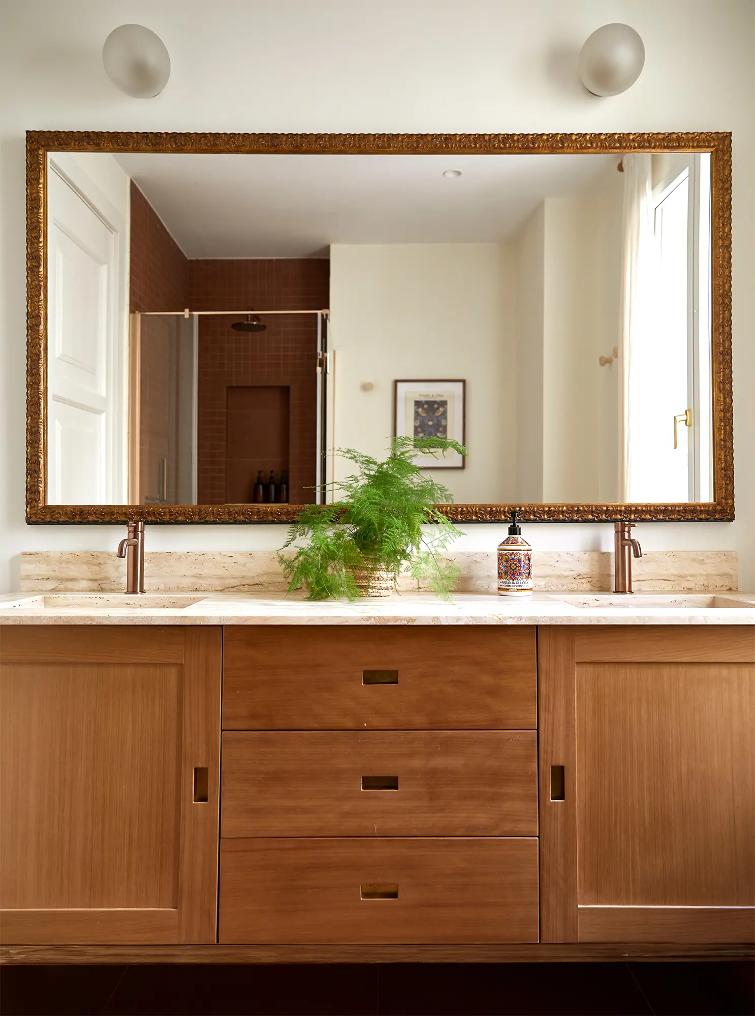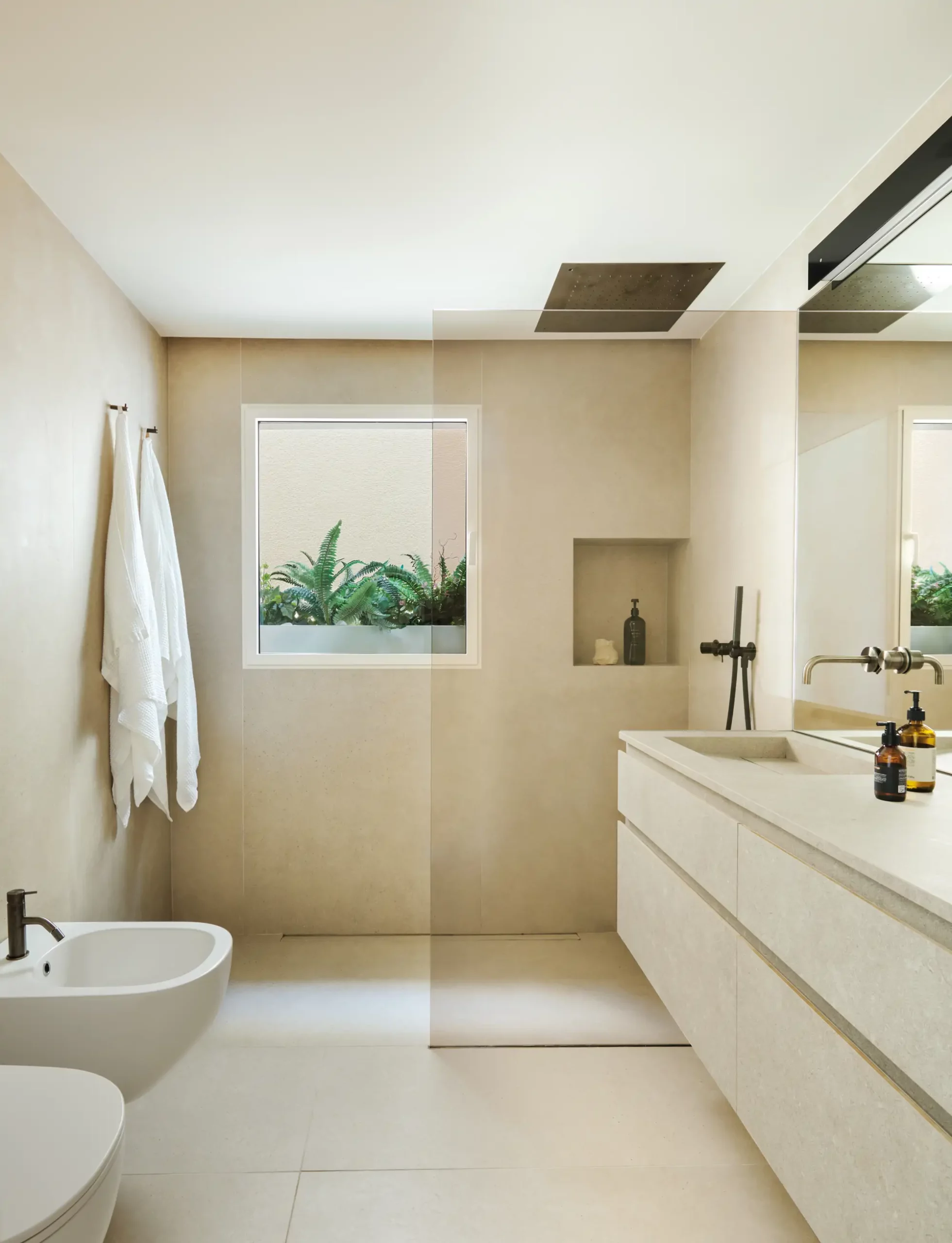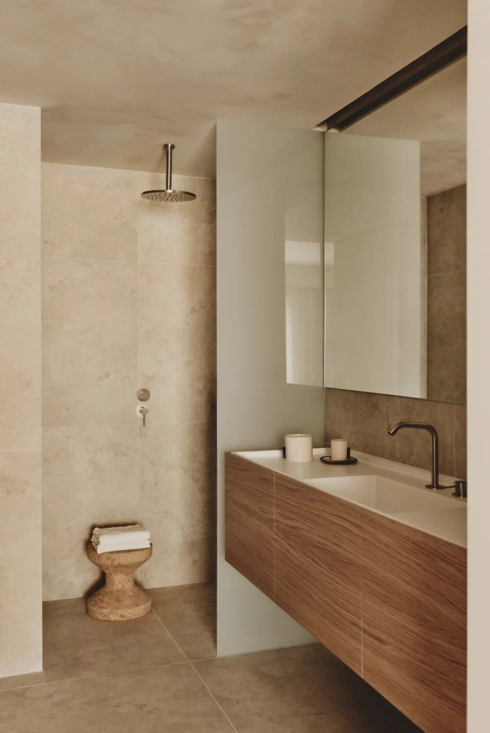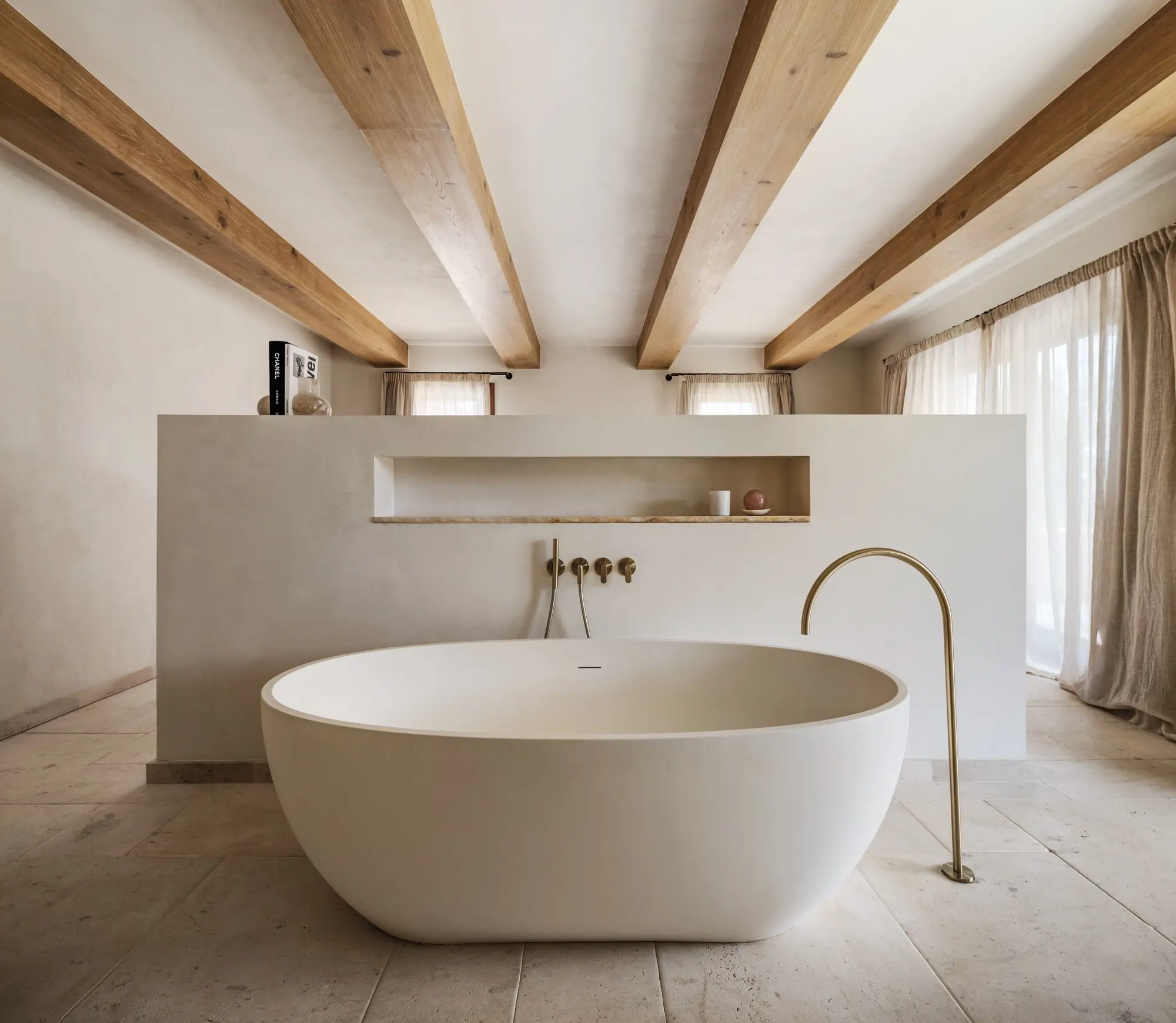 Les tons sable, beige et terre cuite sont intemporels. Ils évoquent la sérénité et s’harmonisent à merveille avec la robinetterie en bronze ou en cuivre vieilli. Ils constituent un choix idéal pour une salle de bain chaleureuse et raffinée. De plus, ces teintes masquent mieux l’humidité et les taches que le blanc pur.