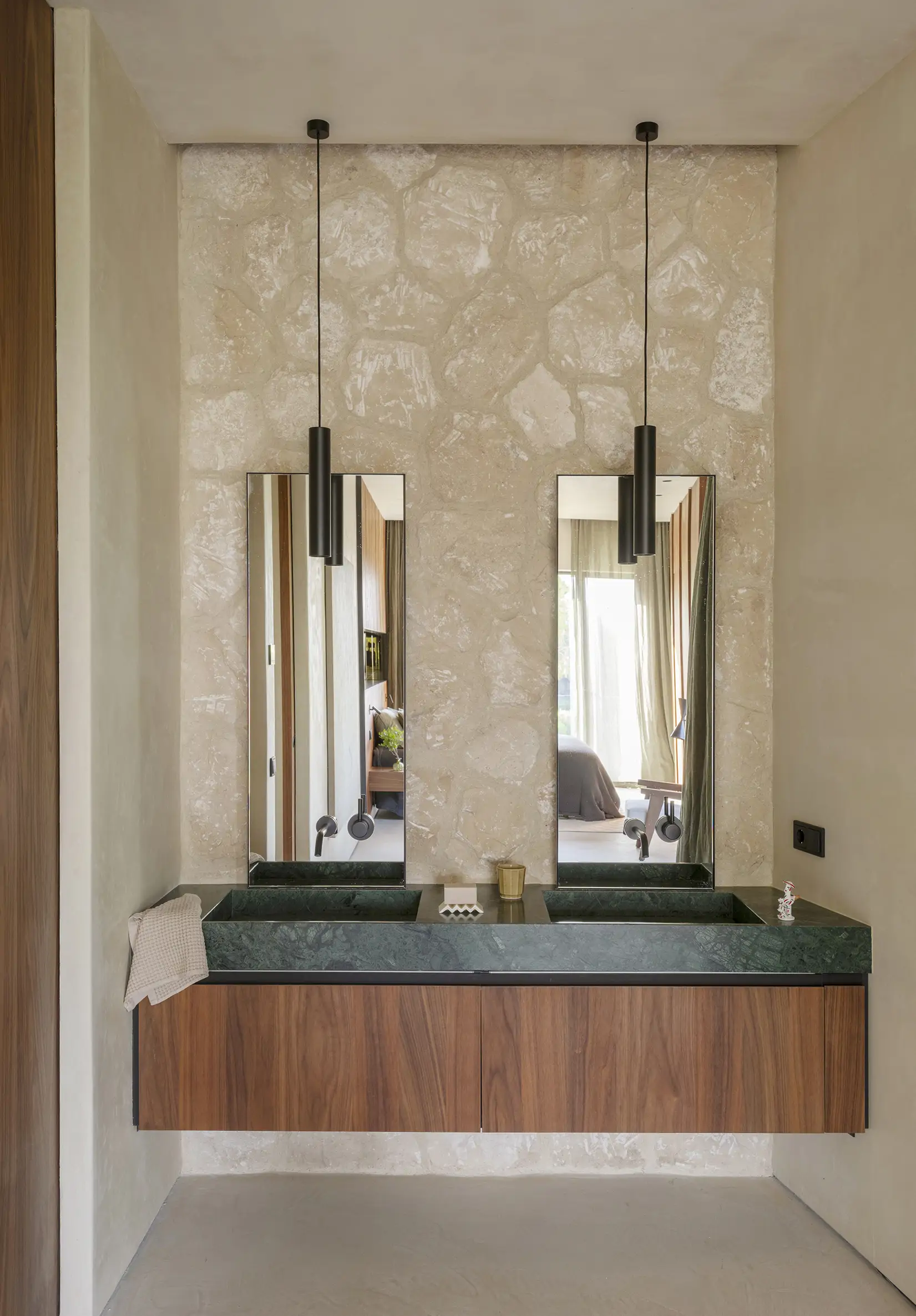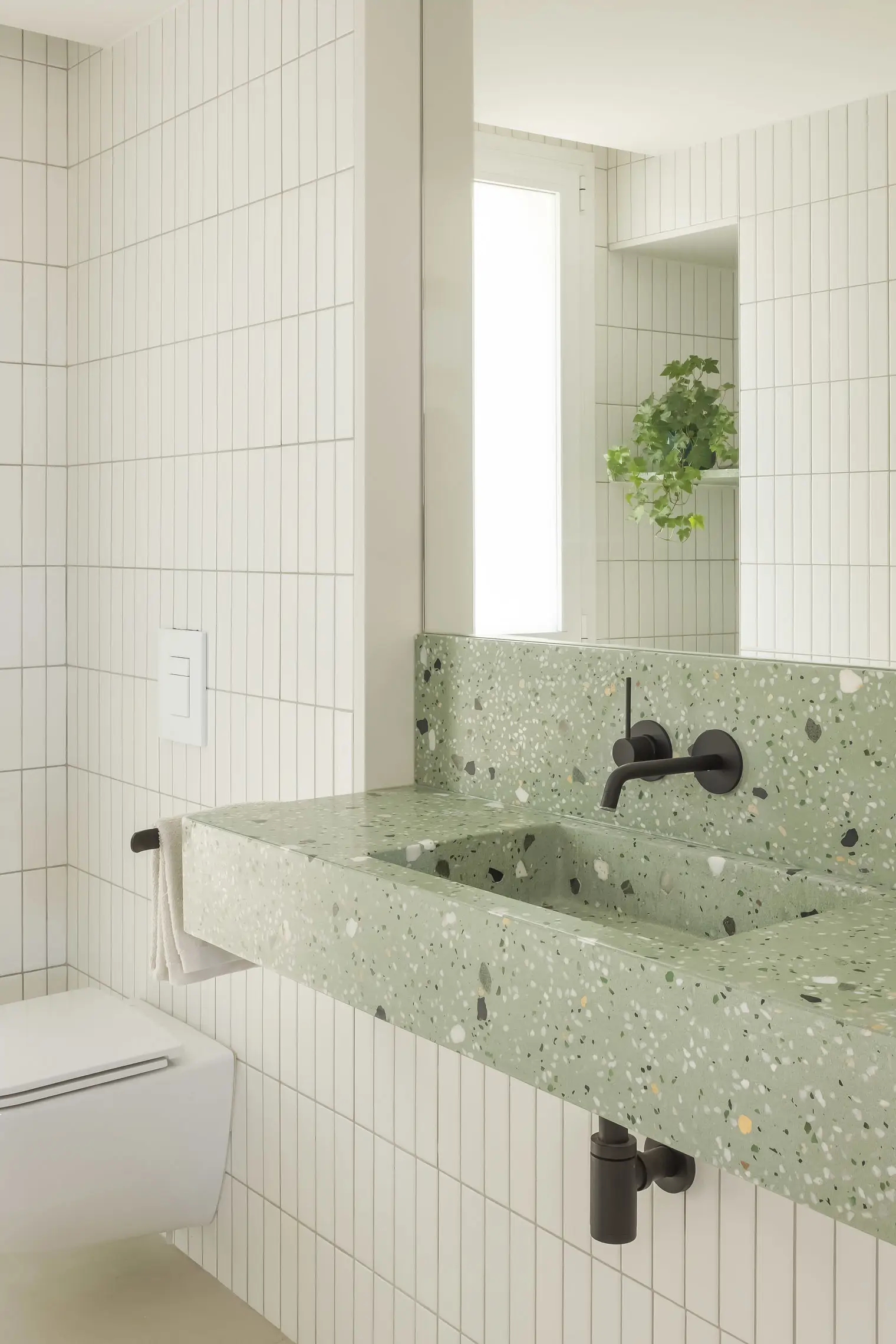 Un lavabo ou un plan de travail en pierre métamorphose complètement l’aspect d’une salle de bain. Le marbre, le terrazzo ou le granit sont des matériaux durables et pleins de caractère. Chaque pièce est unique, et cela se voit. Si vous trouvez cela trop imposant, optez pour la pierre uniquement pour le plan de travail et associez-la à un mobilier sobre. Le résultat sera d’une élégance naturelle.