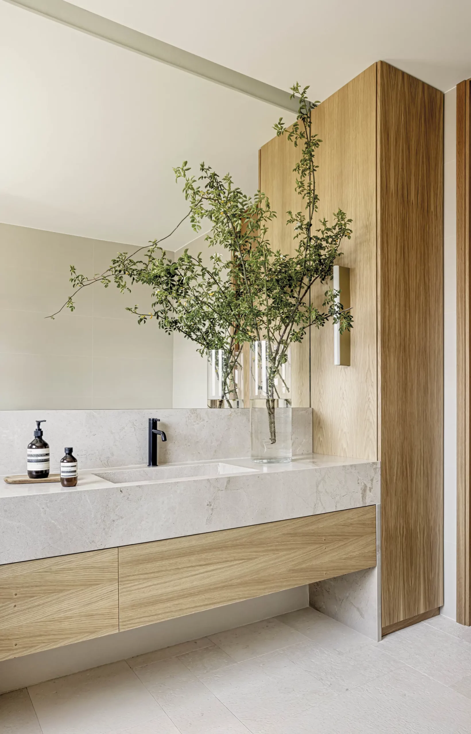 L’alliance du bois et du marbre est une formule gagnante. Le marbre apporte une touche d’élégance, tandis que le bois adoucit l’ensemble. Le marbre est la combinaison gagnante pour 2026.