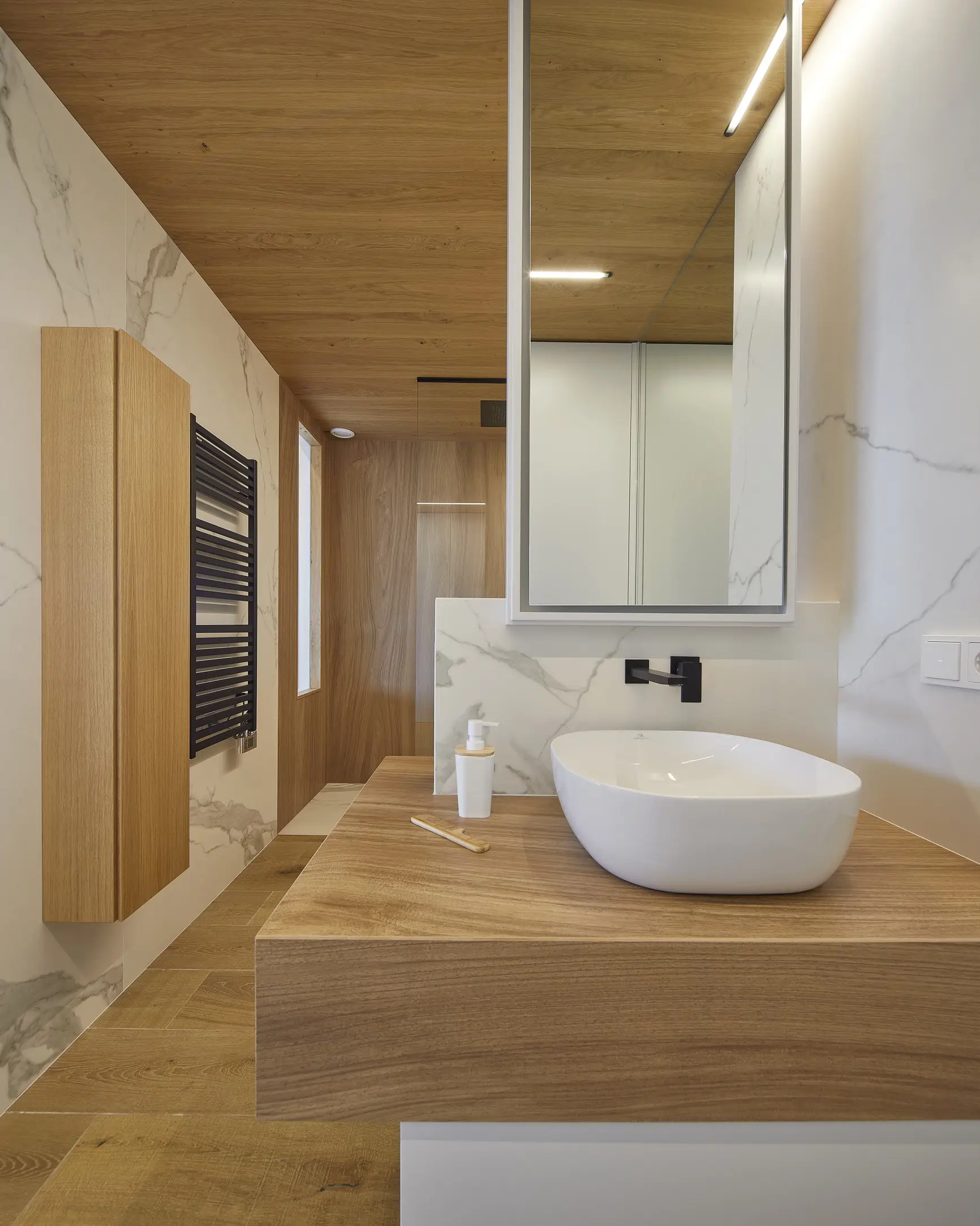 Vous pouvez utiliser le marbre sur les murs ou les sols et réserver le bois au mobilier. Cette combinaison s’intègre aussi bien dans les salles de bains modernes que dans les salles de bains plus classiques.