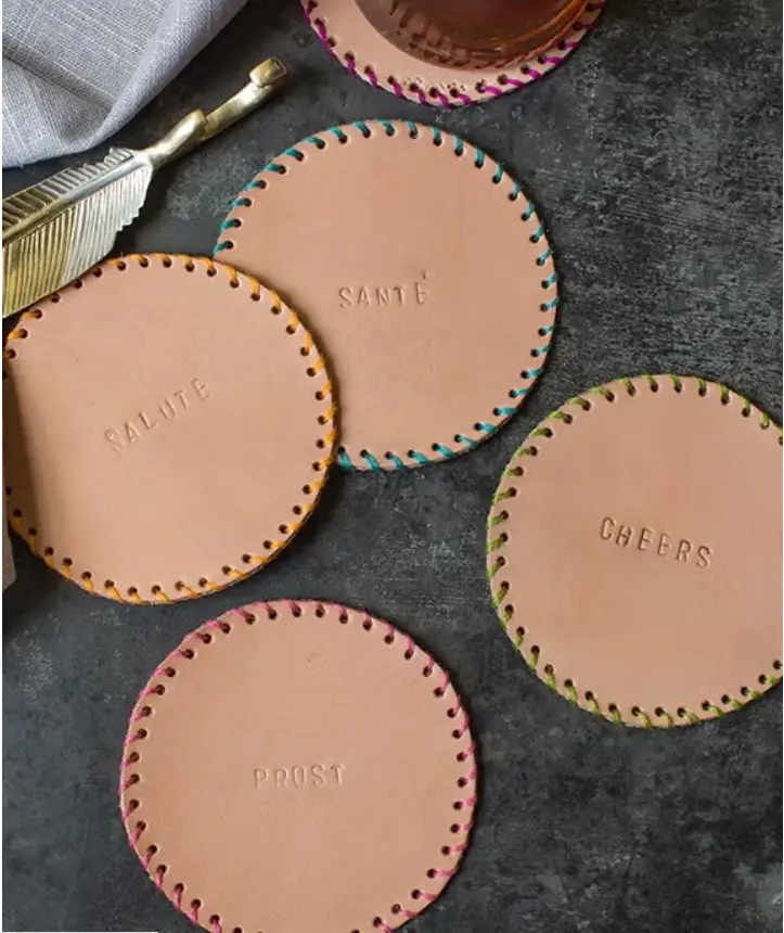 Créez un ensemble de sous-verres personnalisés avec seulement des chutes de cuir, des tampons et de la laine colorée ! Ces petites merveilles ont l’air de sortir tout droit d’une boutique d’artisanat.