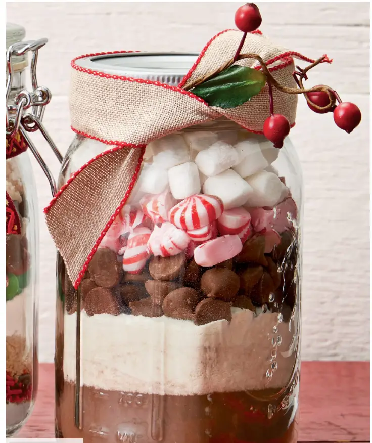 Réchauffez leurs fêtes avec ce mélange pour chocolat chaud maison. Pour le préparer, il suffit de remplir un bocal de cacao en poudre, de lait en poudre et de quelques garnitures amusantes, puis de le décorer d’un joli ruban et de fausses branches de houx.