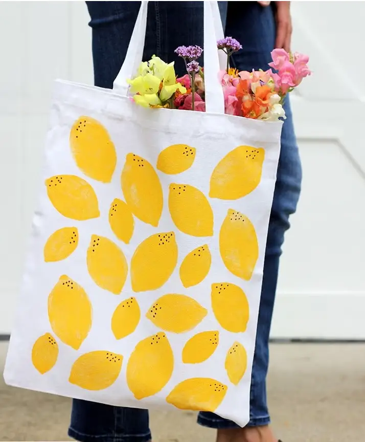 Ce ravissant sac fourre-tout estampillé à la main deviendra sans aucun doute leur nouvel indispensable. Vous pouvez y mettre ces citrons éclatants ou tout autre fruit.