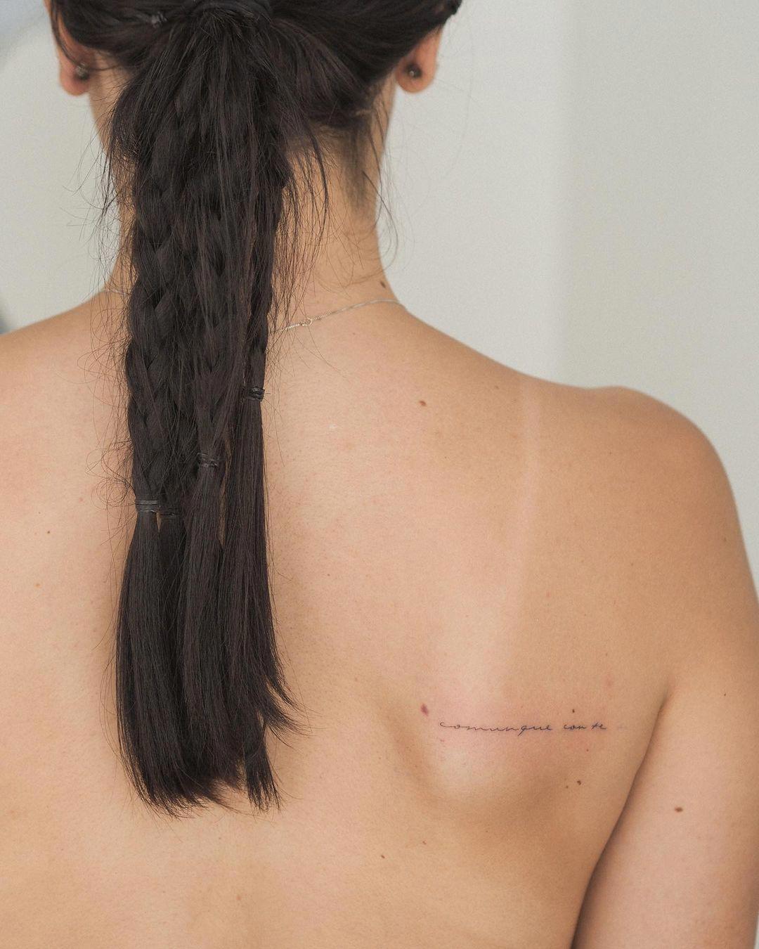 L’un des endroits préférés des femmes pour se faire tatouer une phrase dans le dos est juste au-dessus de l’omoplate . Ici, on voit des phrases finement dessinées en écriture calligraphique, à la fois sophistiquées et discrètes.