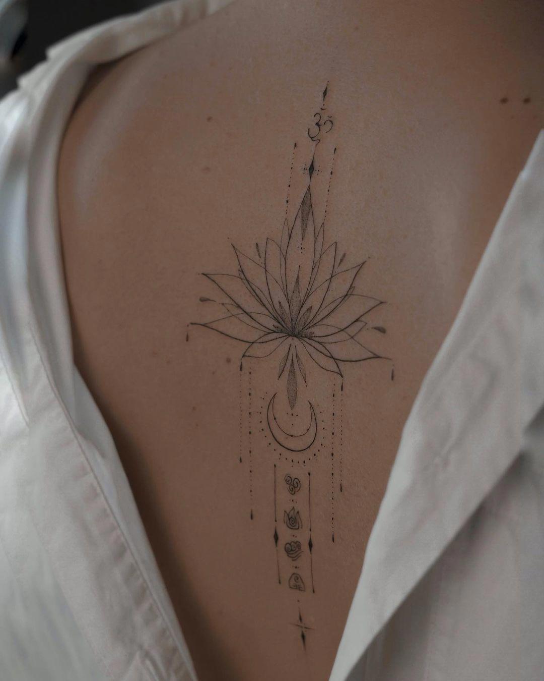 L’une des dernières tendances est le tatouage « fine line » super original sur le dos, plein de symbolisme.