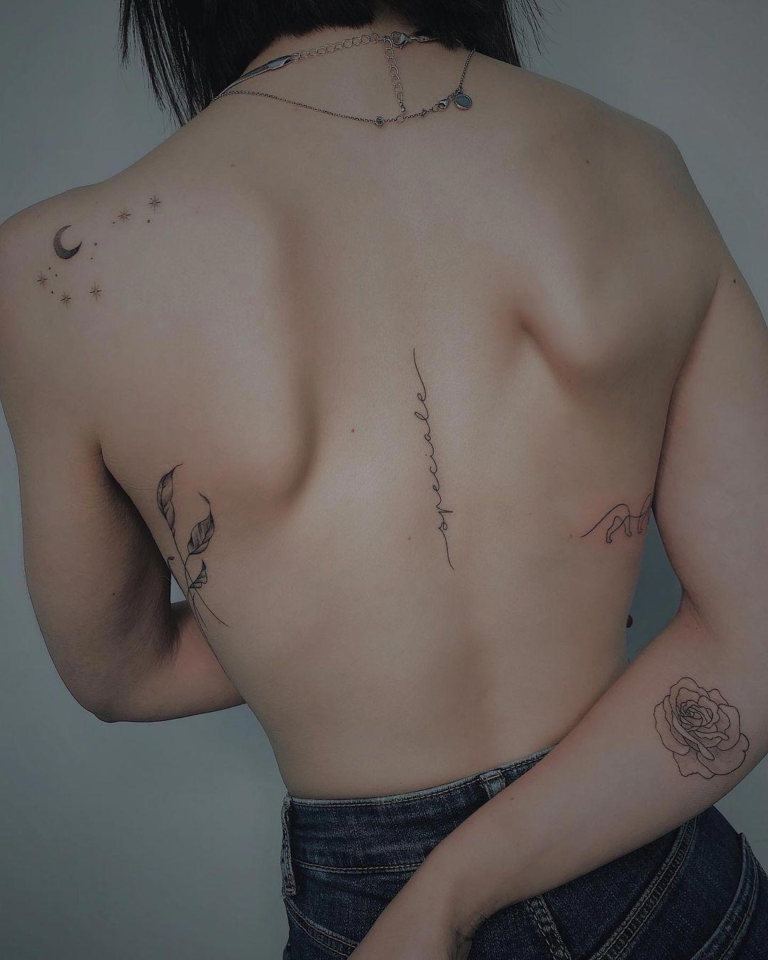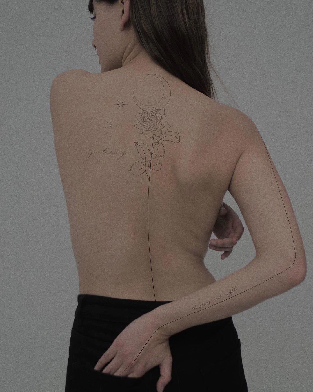 L’un des choix les plus populaires est la composition de tatouages « lignes fines », qui associe des roses , des étoiles, le soleil et la lune, ou des lignes qui courent le long des vertèbres.