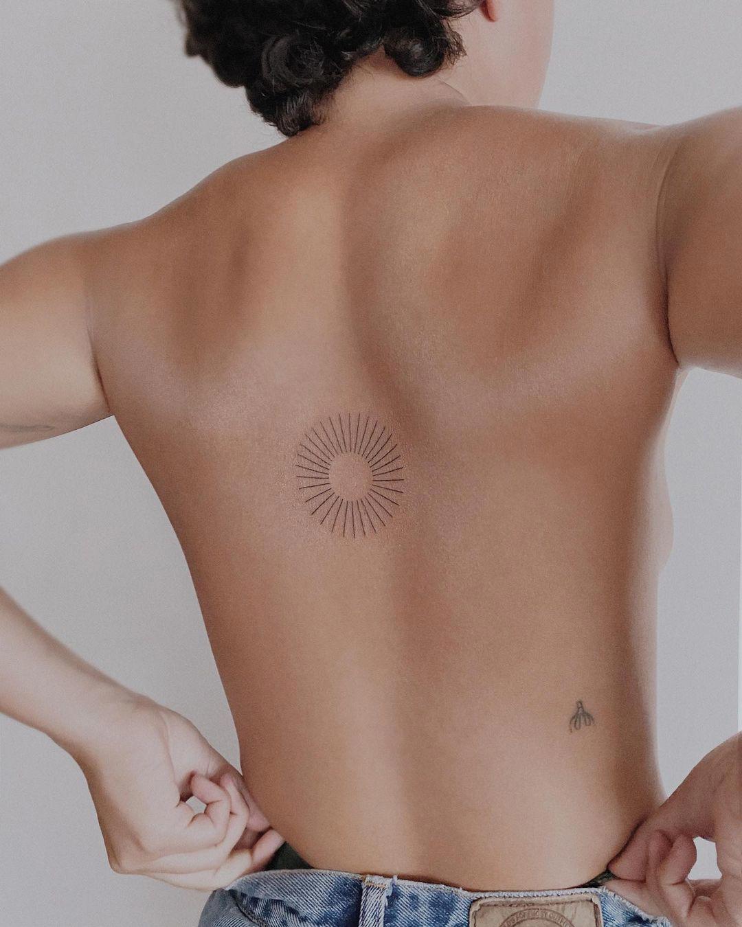 Nous sommes particulièrement attirés par les tatouages placés au centre, évoquant l’équilibre et, dans ce cas précis, la vitalité, l’énergie et la force, car ce tatouage aux lignes fines représente le soleil.