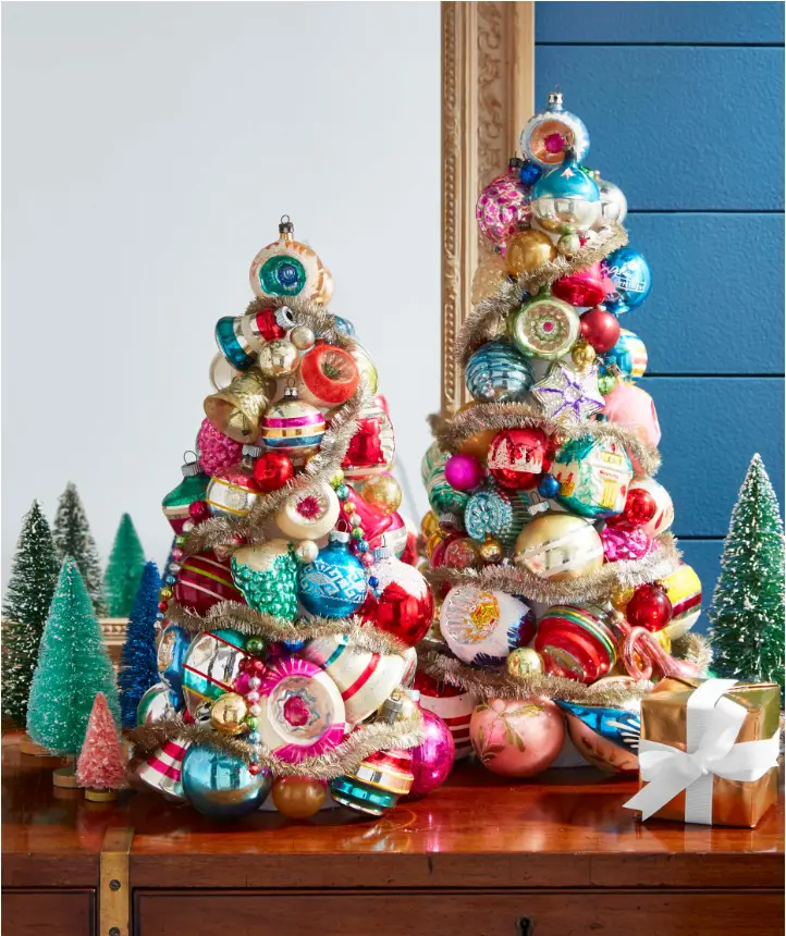 Comblez les espaces vides avec des mini-boules décoratives. Si vous le souhaitez, décorez les sapins avec des guirlandes de perles et de guirlandes de guirlande vintage.