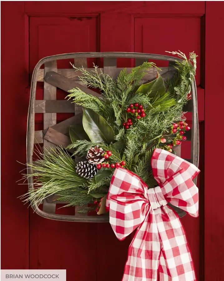 Un panier à tabac rustique, de la verdure fraîche et des baies éclatantes évoquent la tradition, tandis qu’un grand nœud à carreaux apporte une touche de gaieté. Fixez la verdure en un joli bouquet à l’aide de fil de fer et ajoutez quelques pommes de pin. Quelques éléments de décoration sont simples mais apporte la touche finale à notre décoration de Noël.