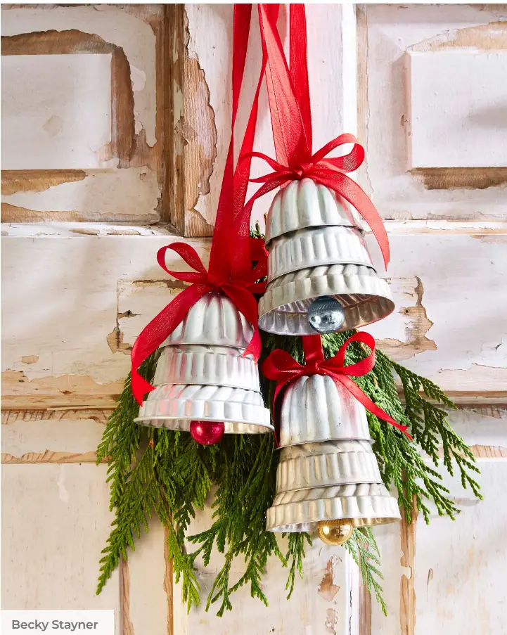Accrochez ces « cloches », fabriquées à partir de mini moules à bundt, à la porte d’entrée ou au-dessus de la cheminée.