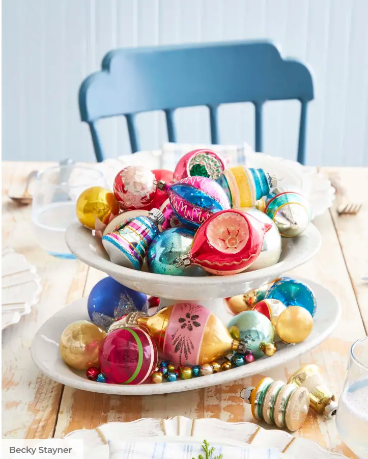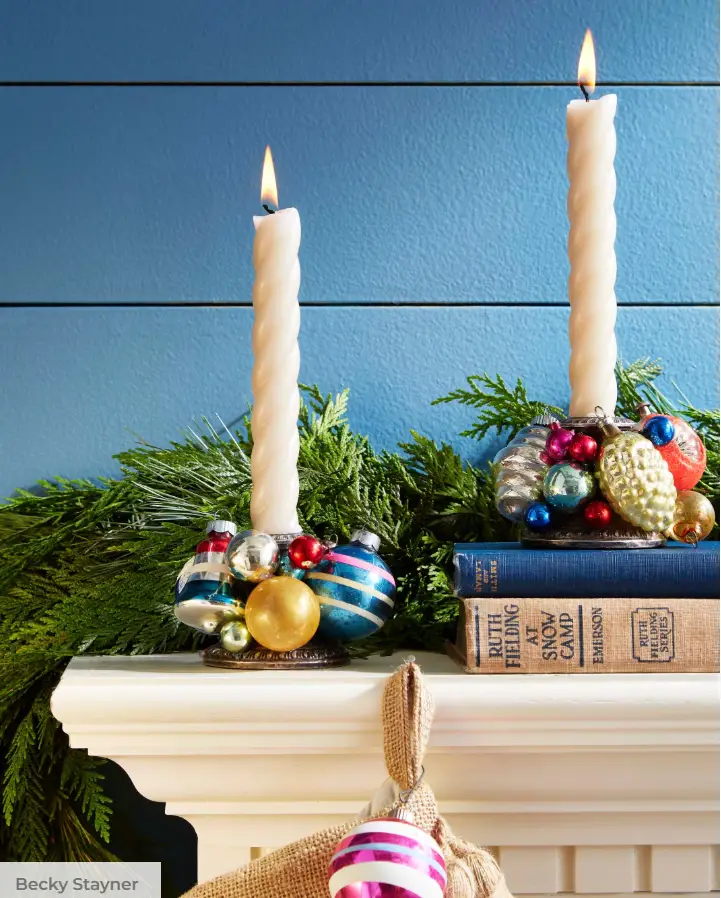 Pour réaliser ces décorations : collez à chaud des ornements de tailles assorties sur des chandeliers en argent ou en verre.